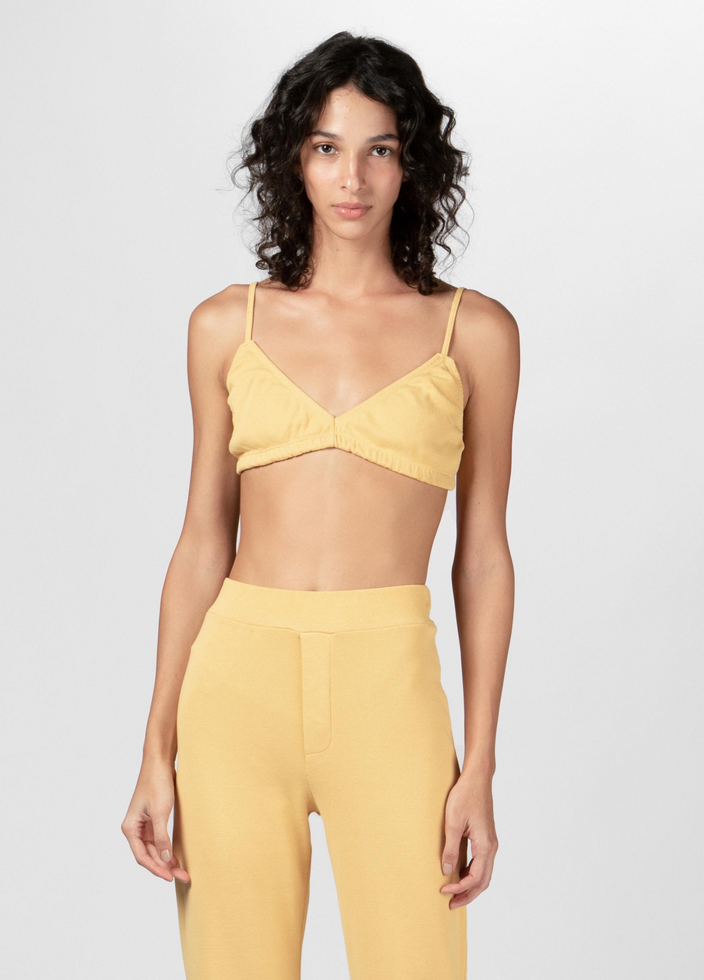 descrição Top tipo sutiã feito em malha de ribana de algodão. A peça tem alças finas não reguláveis e desenho triangular. A peça não tem fechos, mas sim um elástico embutido em toda a circunferência da base. Essa é uma peça Regenerate Life, pois foi produzida com tingimento natural sustentável feito a partir de materiais como cúrcuma, urucum e clorofila, resultando em peças únicas de diversas tonalidades. Seu desenvolvimento reduz em até seis vezes o consumo de água em comparação ao processo convencional. Durante seu processo de lavagem é utilizado amaciante de menta orgânica, cujo cultivo faz parte de um projeto de inclusão social para dependentes químicos em tratamento. Composição: 100% algodão.