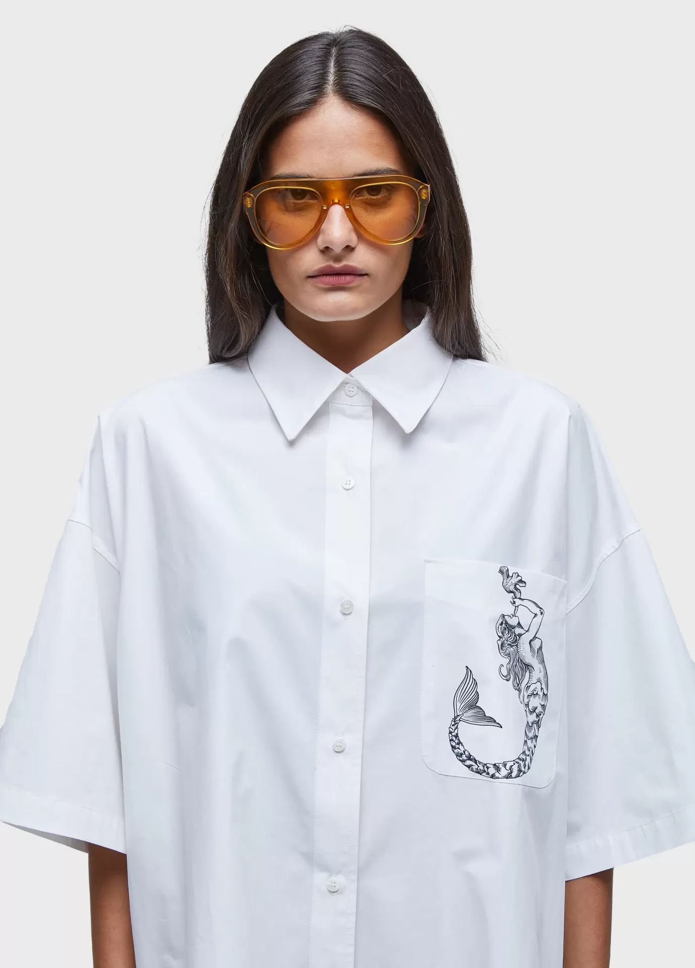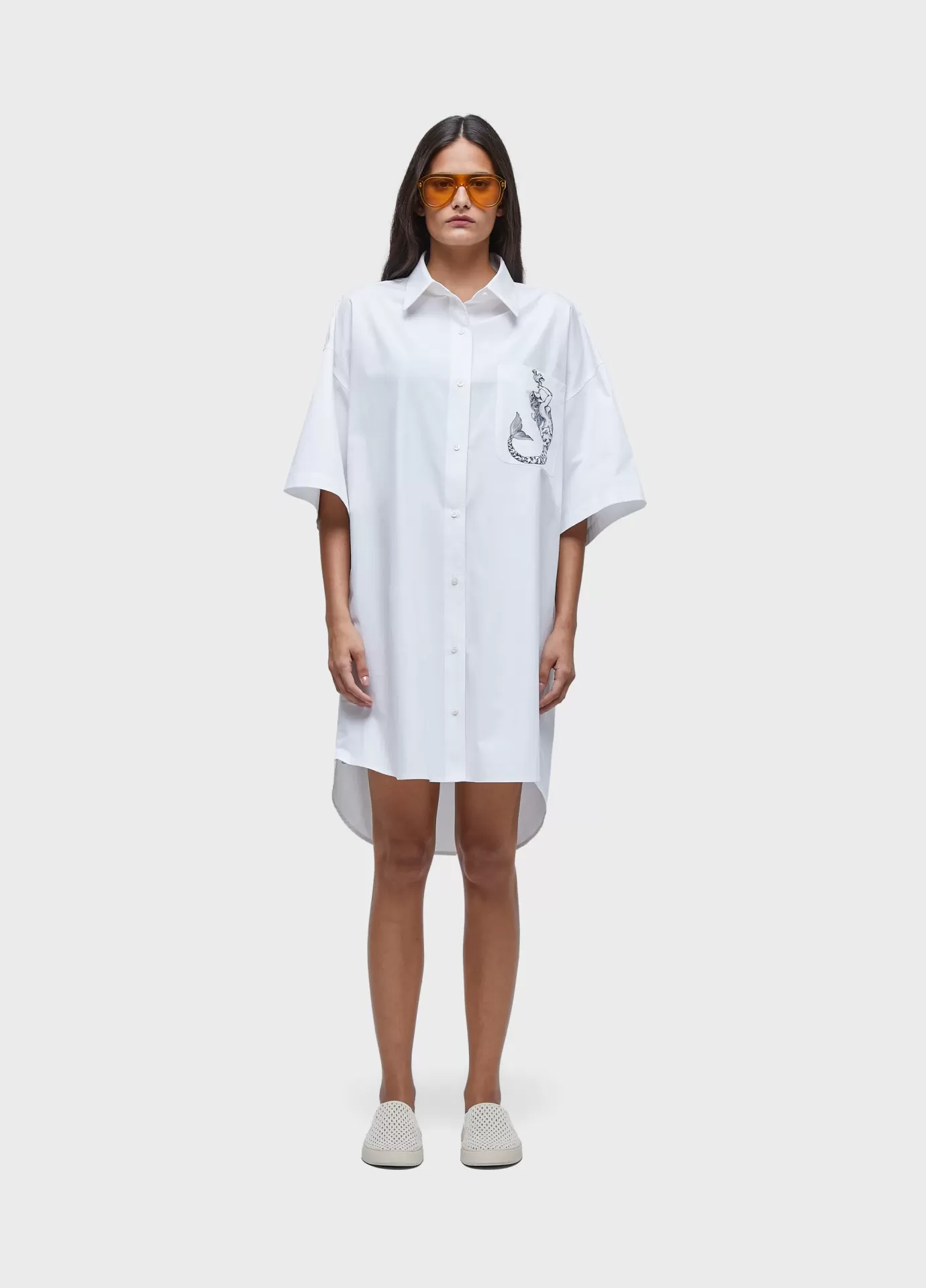 Vestido chemise de mangas curtas e comprimento curto. abotoamento frontal. estampa localizada siren. caimento reto e solto do corpo. tecido de algodão.