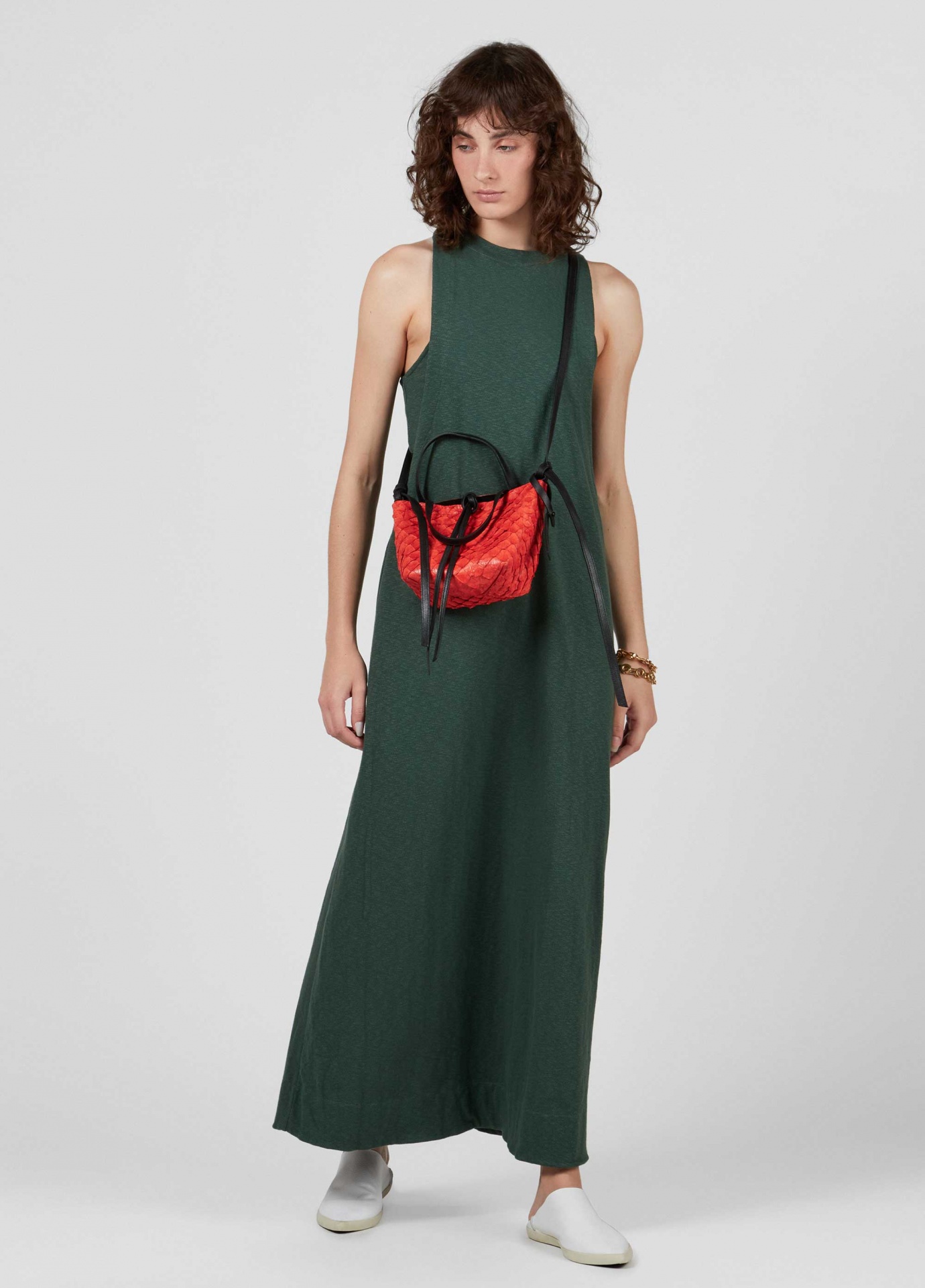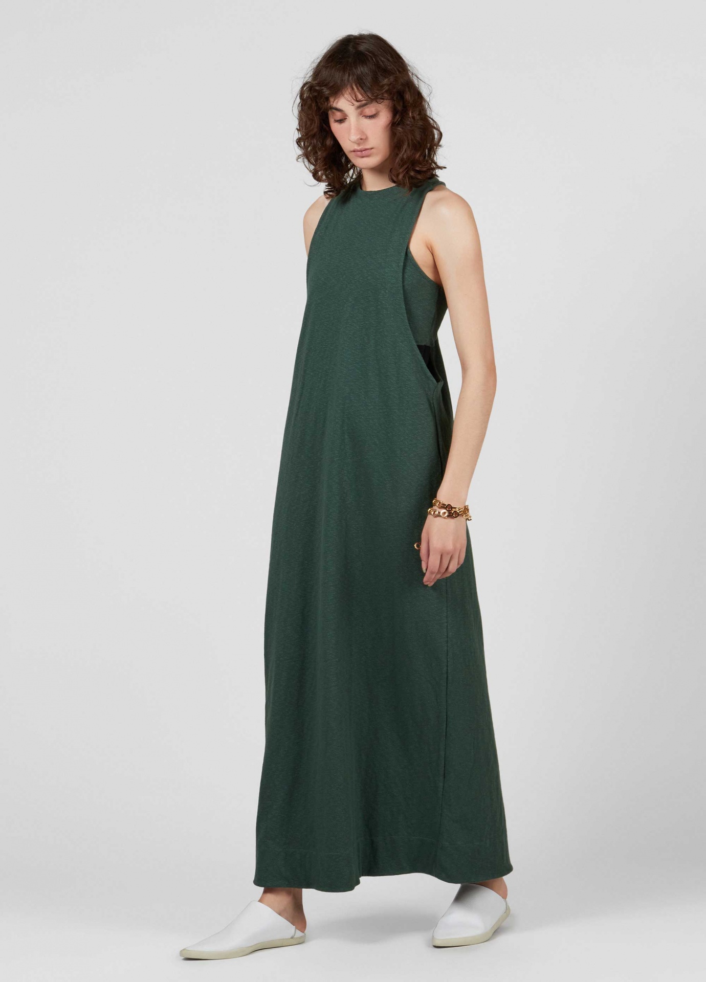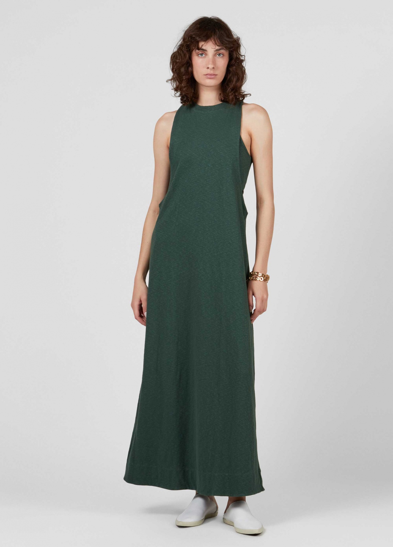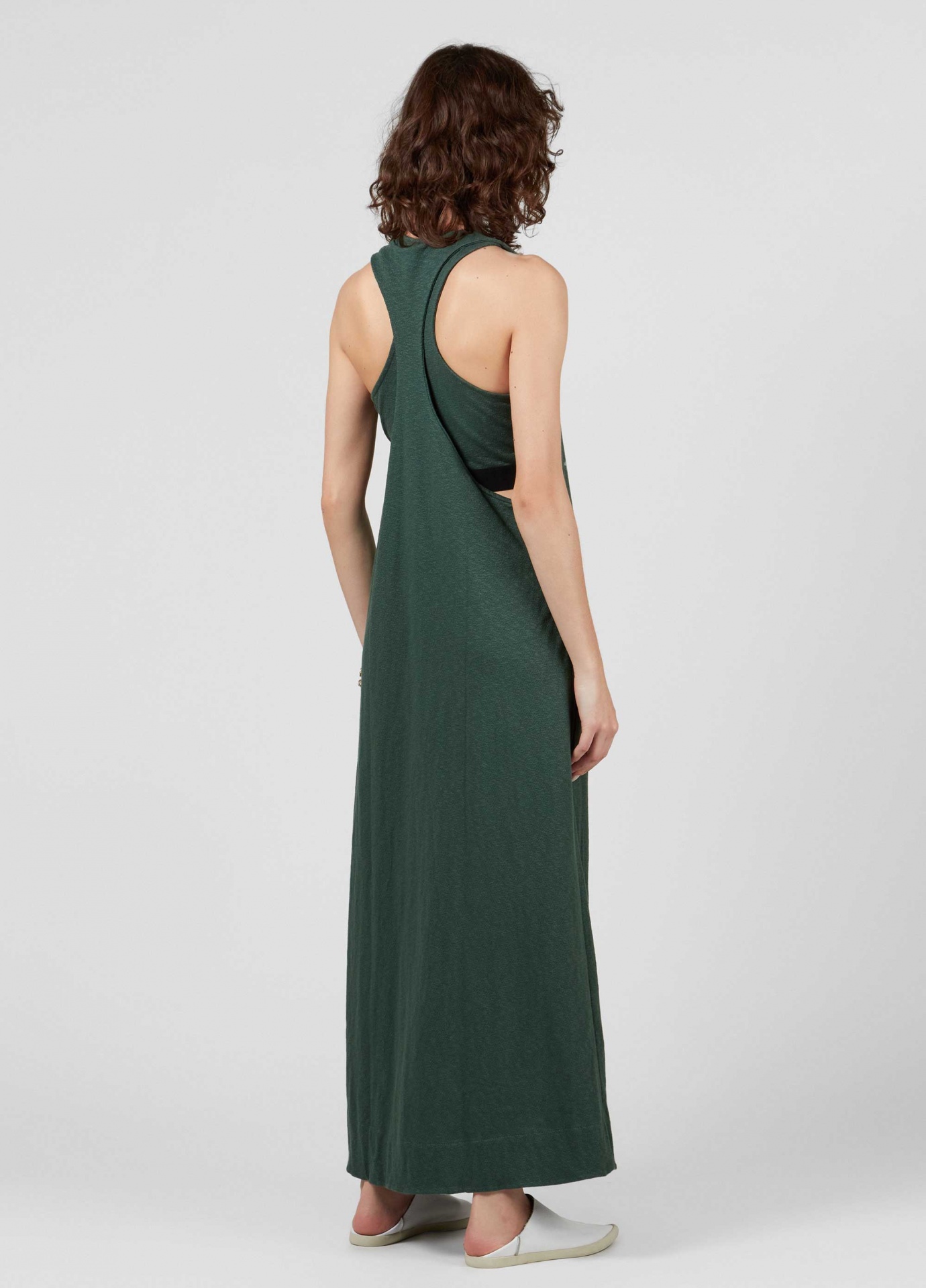 Vestido longo feito em malha rusty. A peça tem decote nadador com cavas extremamente amplas, vindo com um top interno, também nadador, para cobrir o busto. O vestido tem caimento mais ajustado no busto, descendo em a até a barra. O vestido e o top podem ser usados separadamente. Essa é uma peça regenerate life, pois foi produzida com algodão nacional certificado seguindo critérios minuciosos de redução dos impactos ambientais e sociais durante seu cultivo. Seu processo produtivo utiliza energia renovável, reduz o consumo de água e fomenta as cadeias produtivas brasileiras. Composição: 95% algodão 5% elastano.