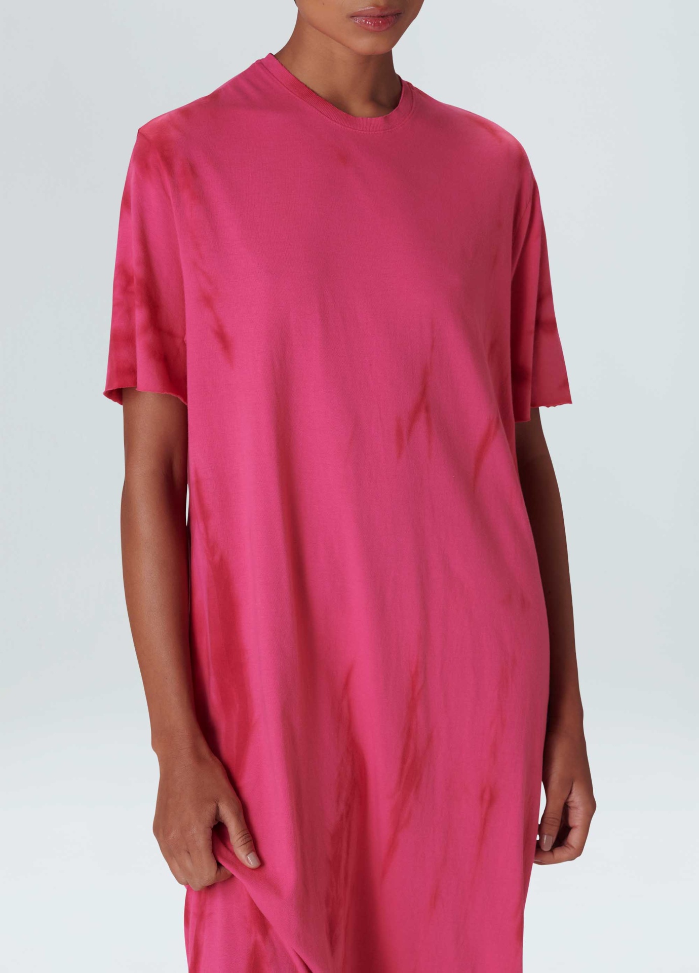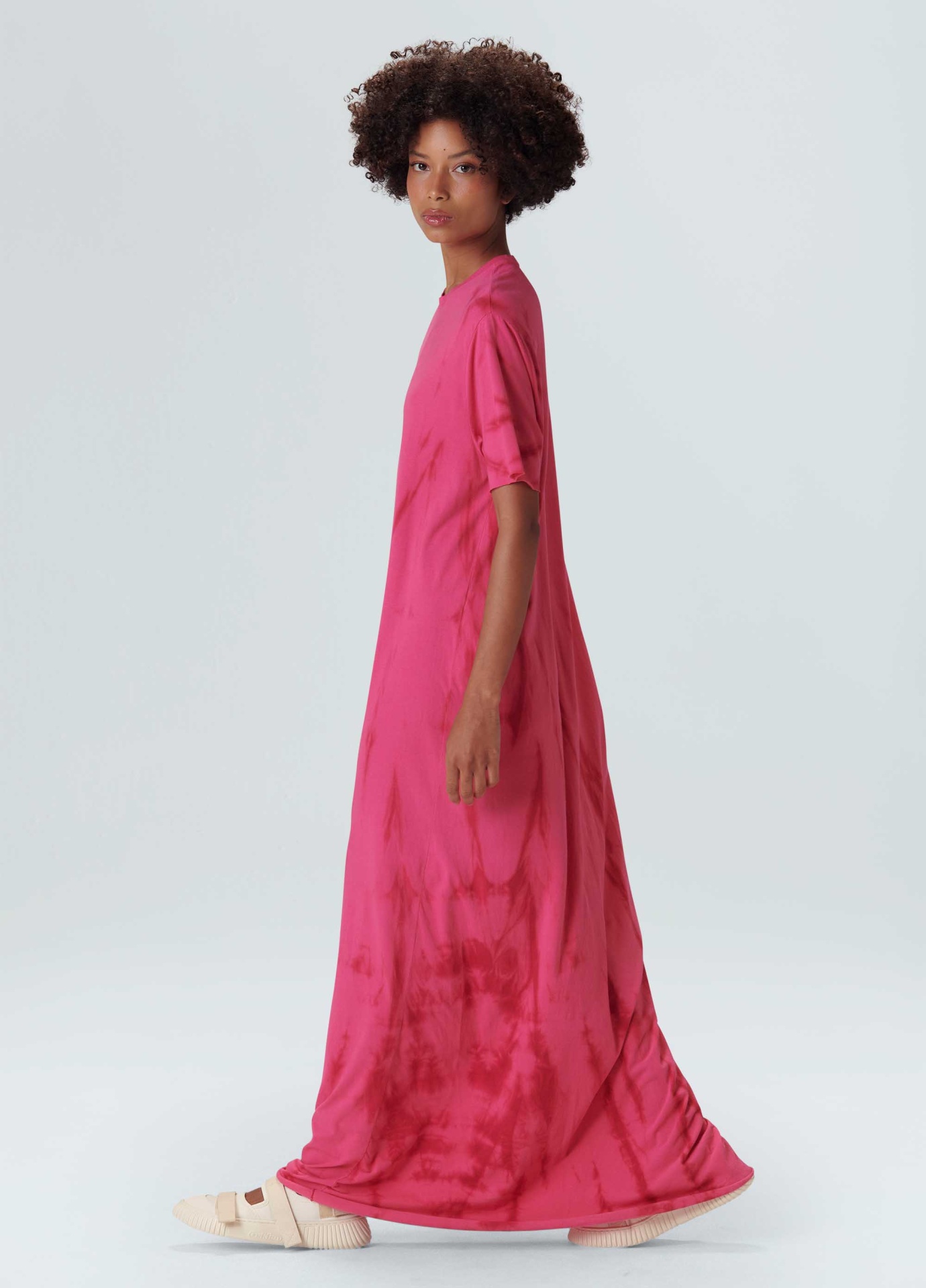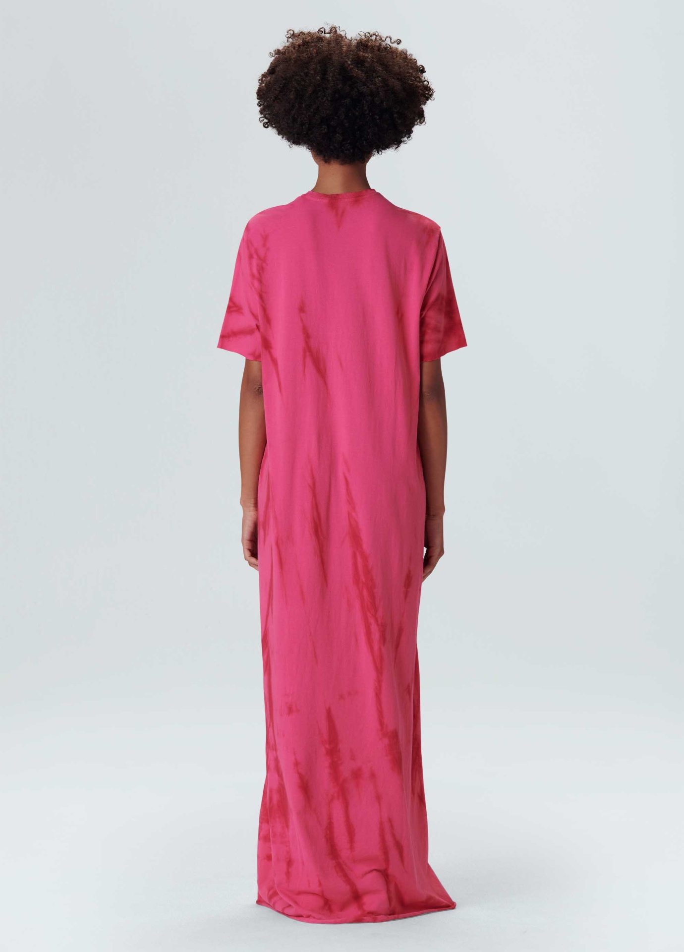 descrição Vestido longo feito em malha de algodão. A peça tem modelagem tipo t-shirt, reta e solta no corpo. Suas costuras laterais são deslocadas para a frente. A peça tem tingimento em tie dye para criar padrões irregulares. Essa é uma peça Regenerate Life + Respect Our People, pois foi produzida com algodão certificado, matéria-prima produzida a partir de critérios socioambientais e econômicos. Sua produção utiliza energia renovável, reduz o consumo de água e fomenta a sustentabilidade das cadeias produtivas brasileiras. O amaciamento das fibras é feito com Organic Mint Wash, produzido a partir do óleo essencial da menta orgânica. Cultivada em pequenas hortas de um projeto de responsabilidade social, promove a recuperação e ressocialização de dependentes químicos. Essa iniciativa colabora para a redução dos impactos ambientais e estimula a gestão sustentável e inclusão social em cadeias produtivas.
