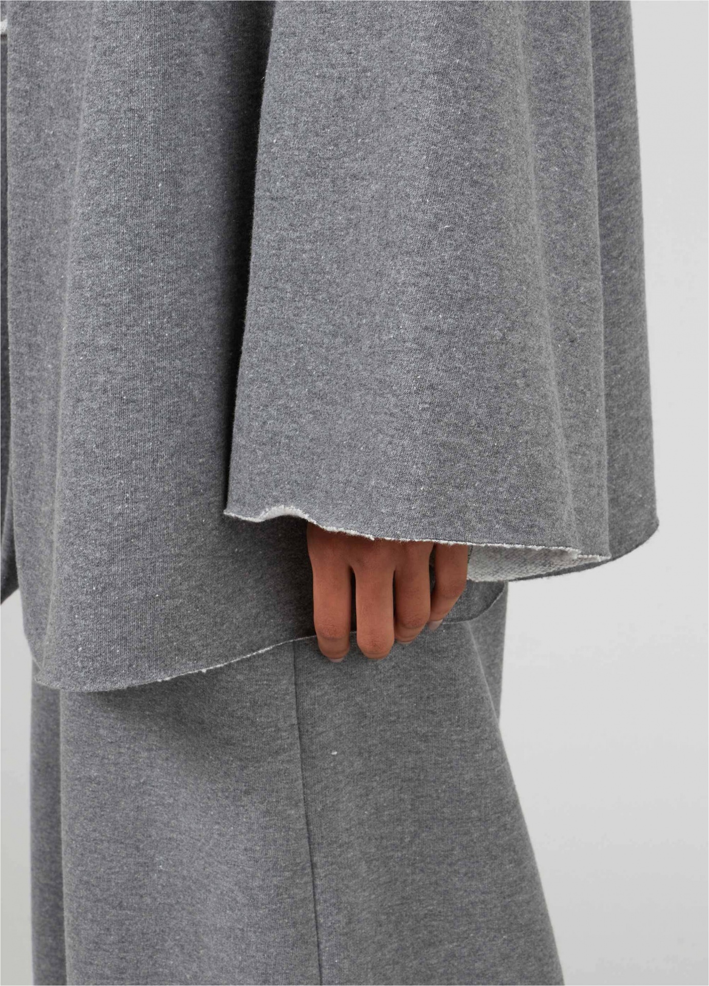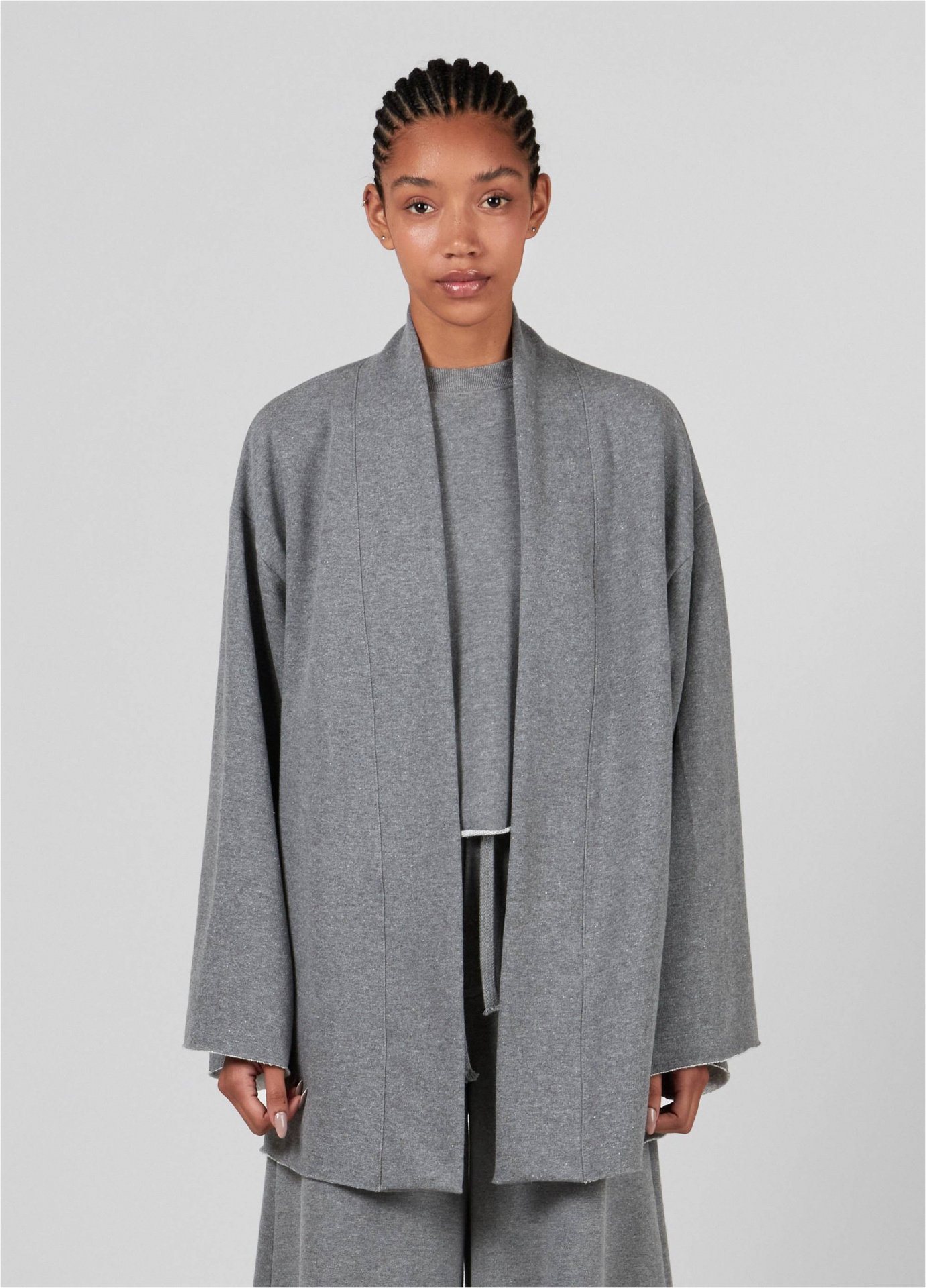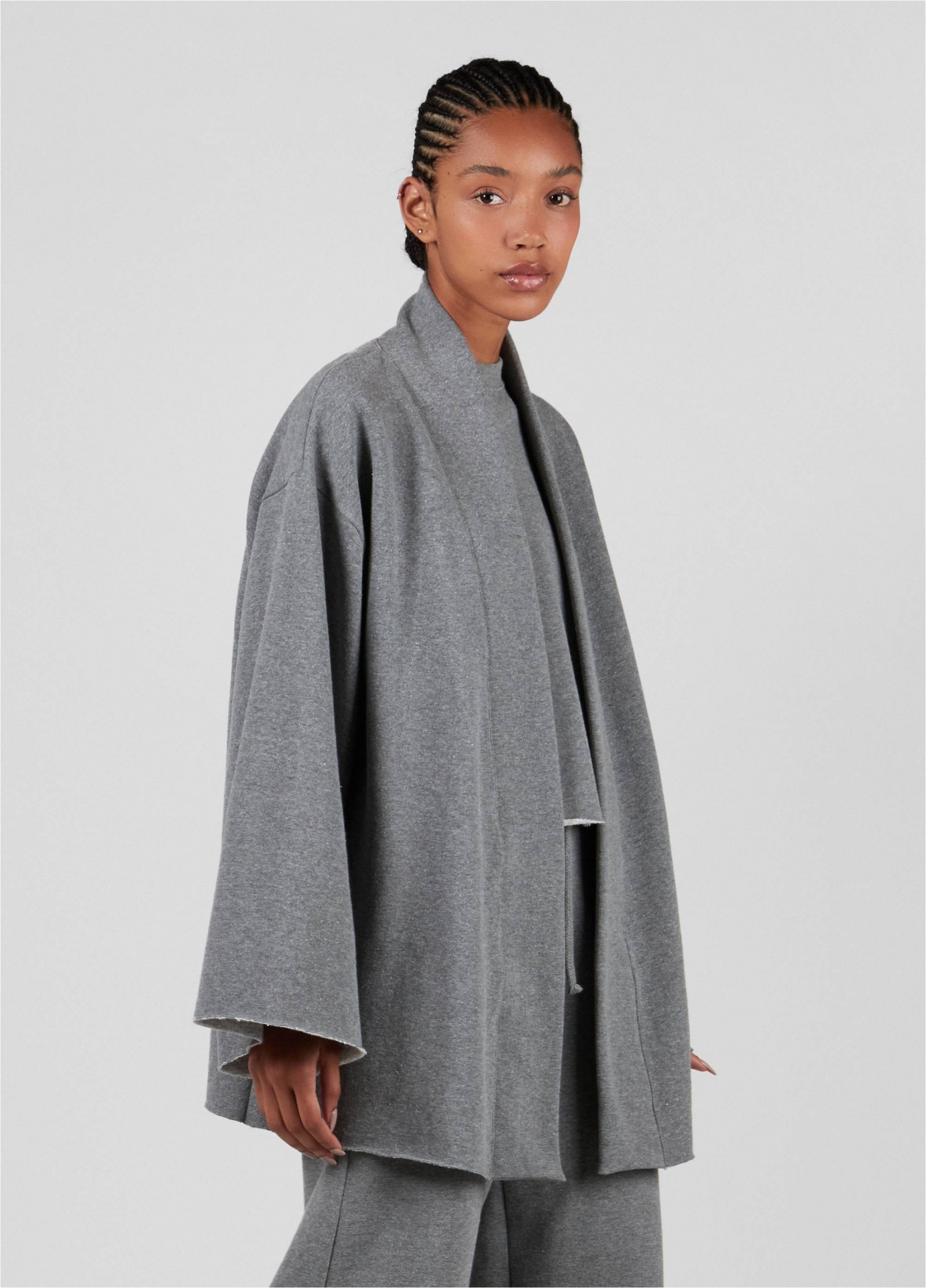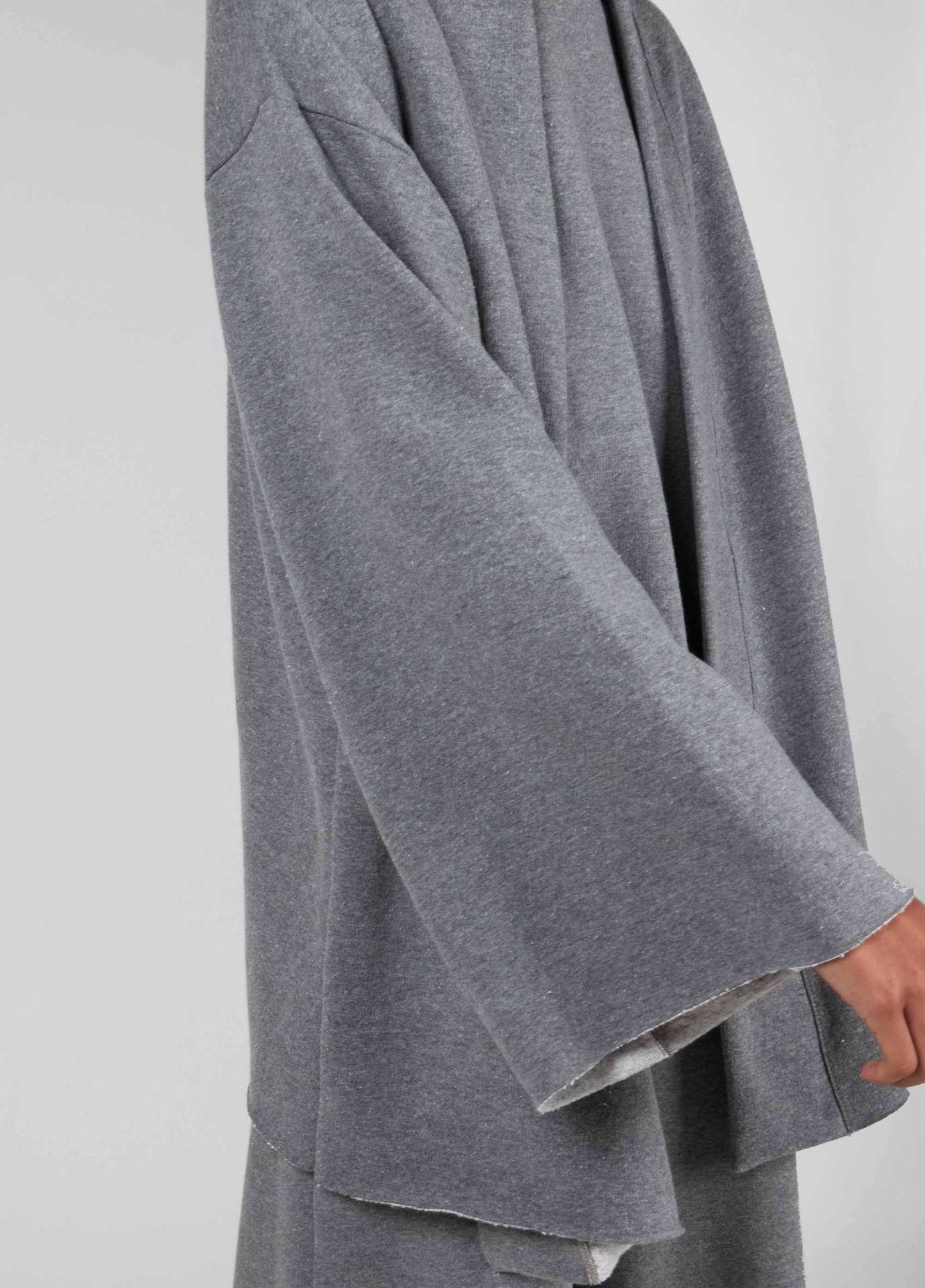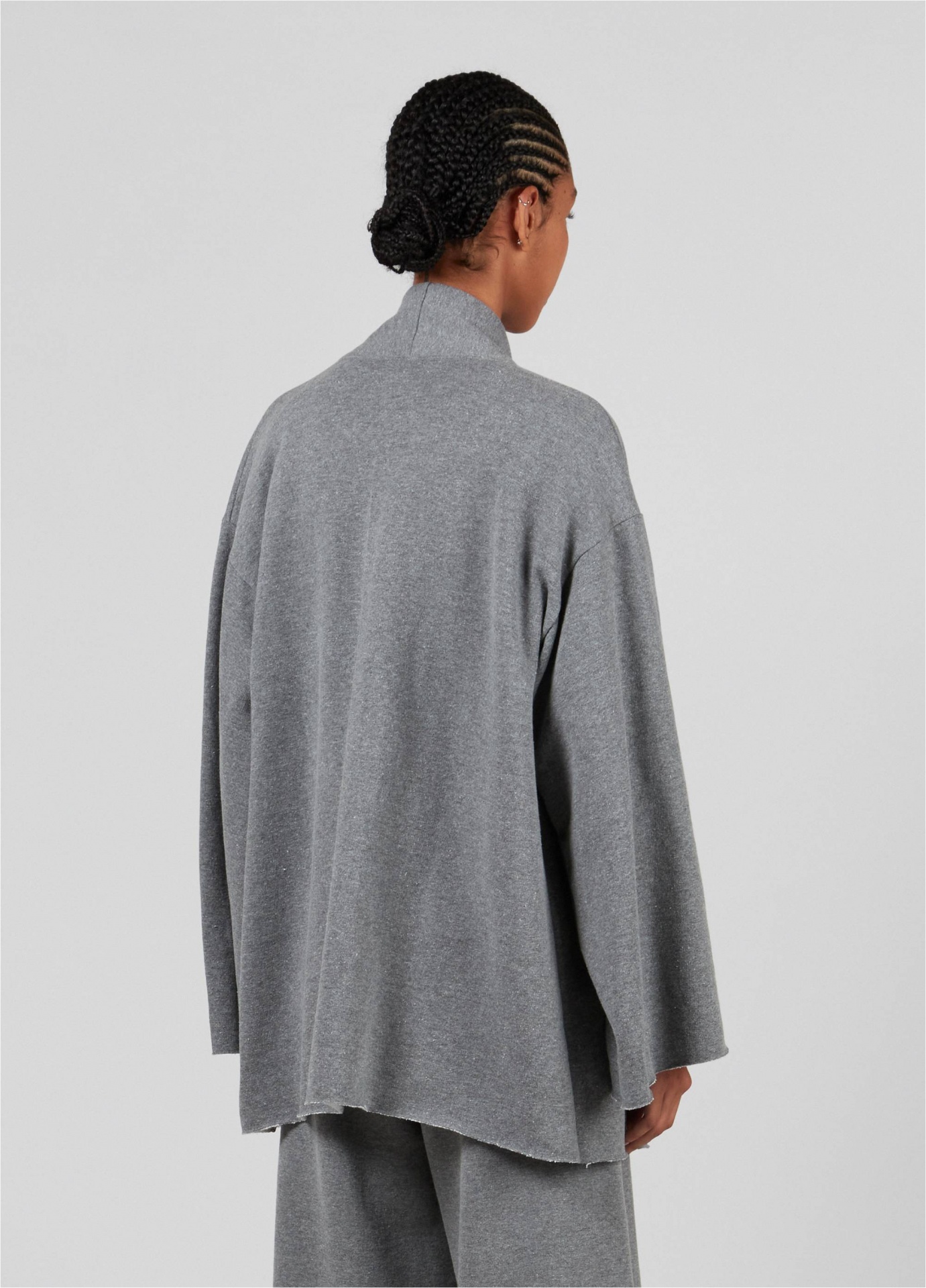 Casaco tipo cardigan feminino feito em moletom. A peça, oversized, tem comprimento longo e mangas amplas. Seus acabamentos são a fio. A peça tem um silk externo emborrachado na cor da peça. Essa é uma peça redesign waste, pois foi produzida através do reaproveitamento de resíduos têxteis. Os retalhos são separados por cores e desfibrados para que sejam transformados novamente no fio que dá origem à este produto. Essa iniciativa elimina o uso de produtos químicos, economiza água e minimiza o volume de resíduo têxtil, diminuindo os impactos ambientais. Composição: 42% fibras diversas 39% algodão 19% poliéster.