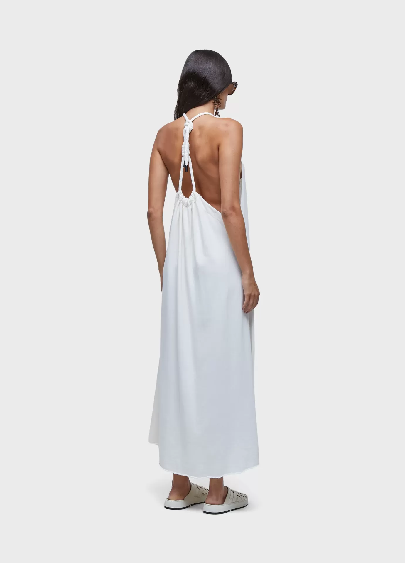 Vestido frente única com amarração de cadarço de algodão nas costas. comprimento longo e modelagem em a, com bastante volume de saia. malha de algodão certificado com amaciante de menta orgânica.