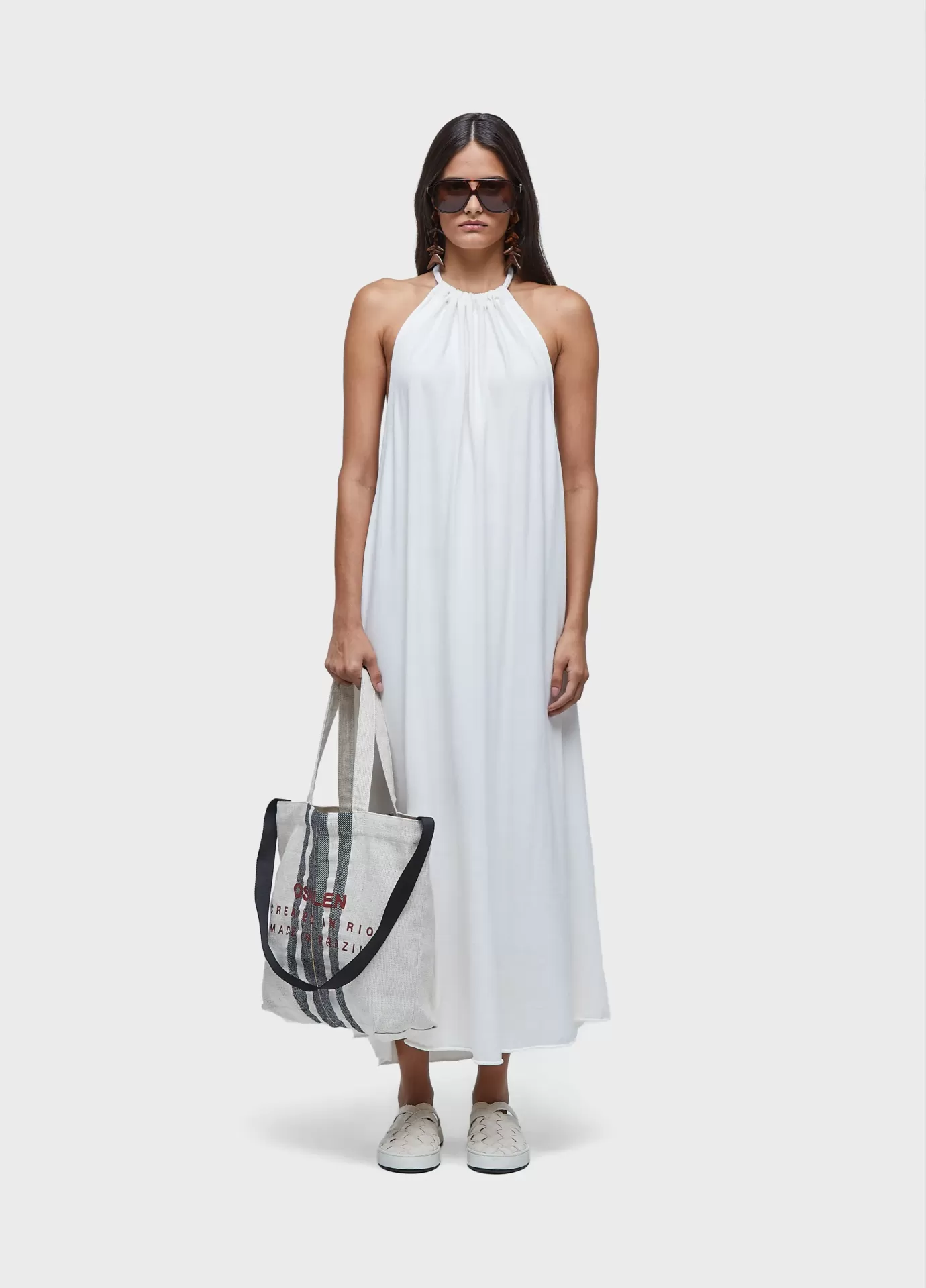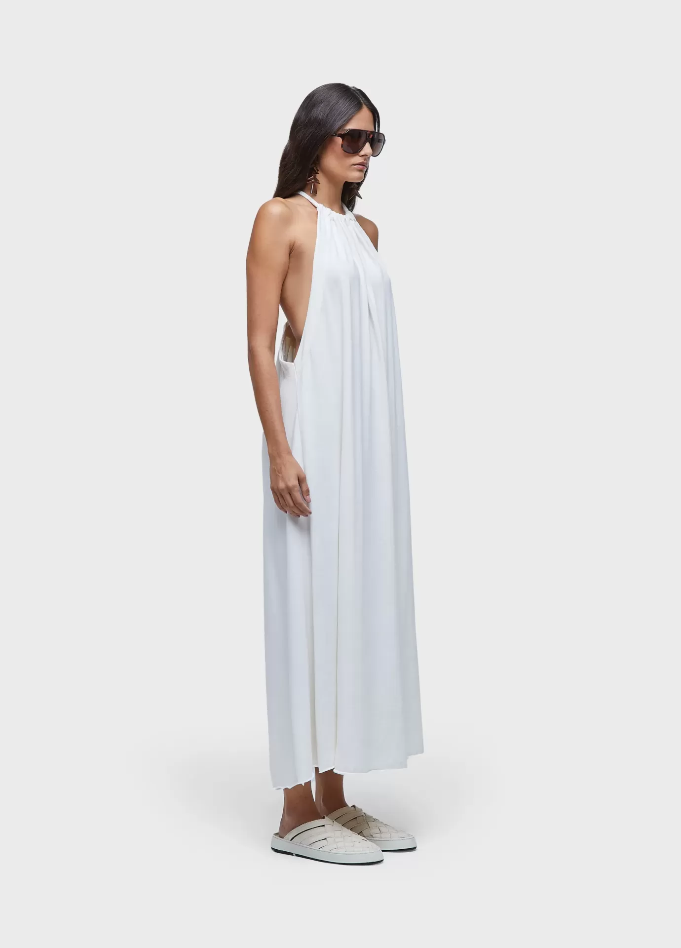 Vestido frente única com amarração de cadarço de algodão nas costas. comprimento long