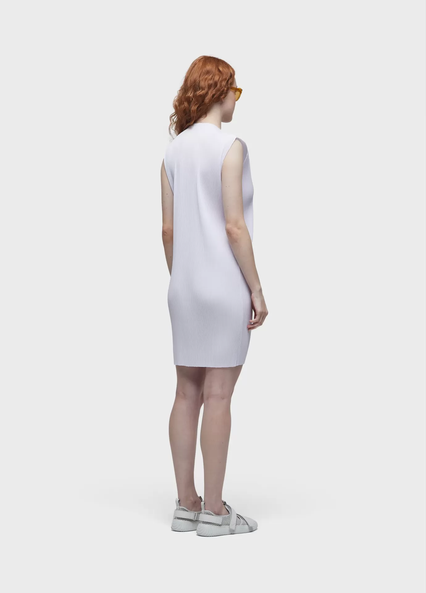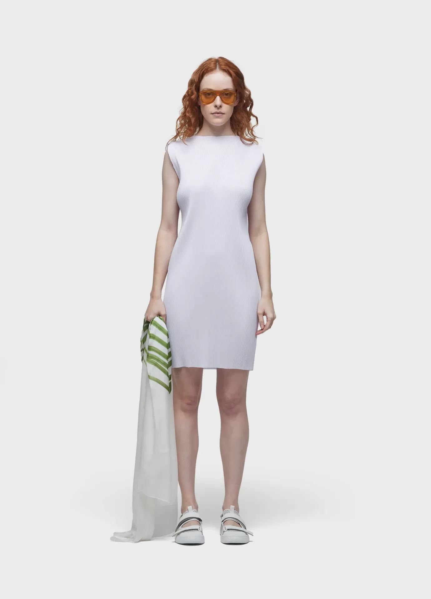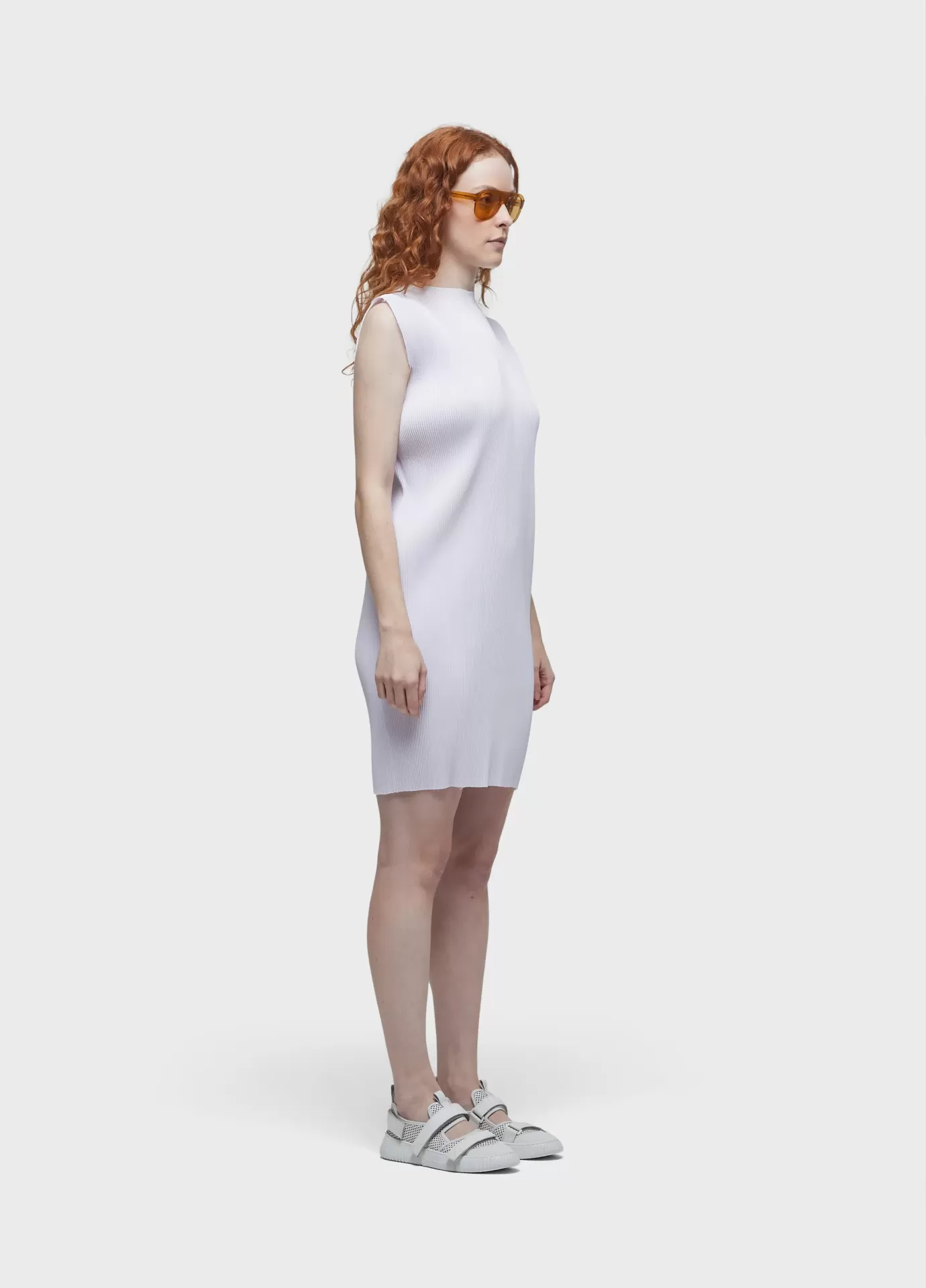 Vestido sem mangas de gola subidinha. comprimento curto. caimento reto. peça plissada. tecido de poliéster e elastano. não dobrar a peça para não danificar o plissado, deve ser guardada pendurada.