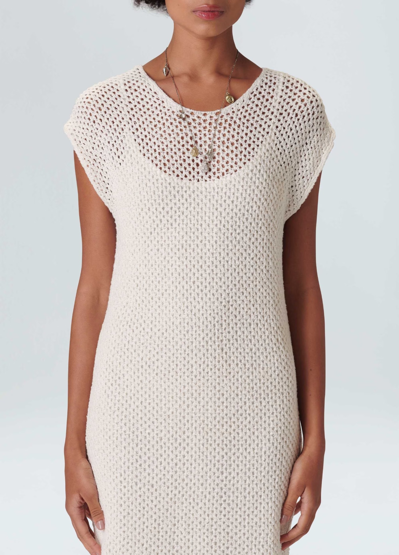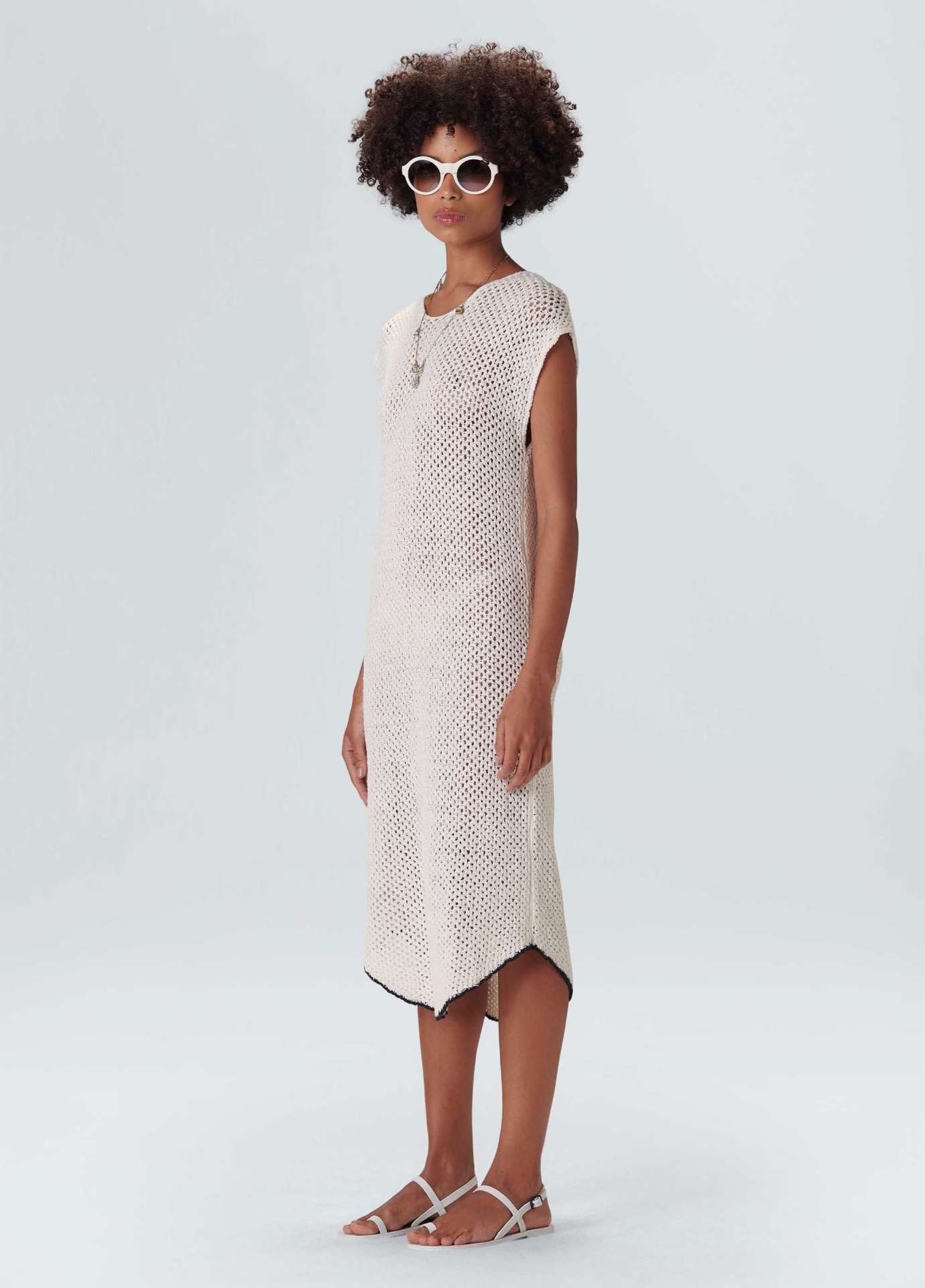 Vestido de tricot com fio de algodão reciclado com ponto aberto, deixando a peça transparente. Modelagem solta no corpo, decote fechado e fraldado na barra. A peça tem frisos na cor preta nas cavas e na barra. O vestido acompanha forro. Bandeira Re-design Waste. Ao usar algodão reciclado em suas coleções a Osklen evita que cerca de 7,5 toneladas de resíduos têxteis sejam descartados por ano.