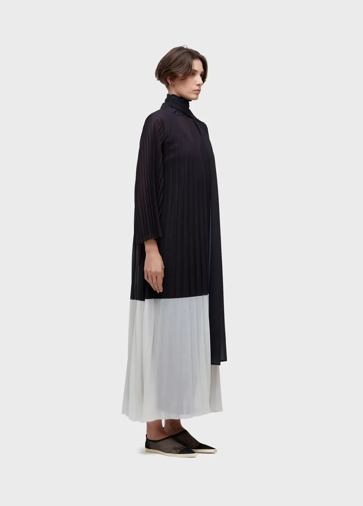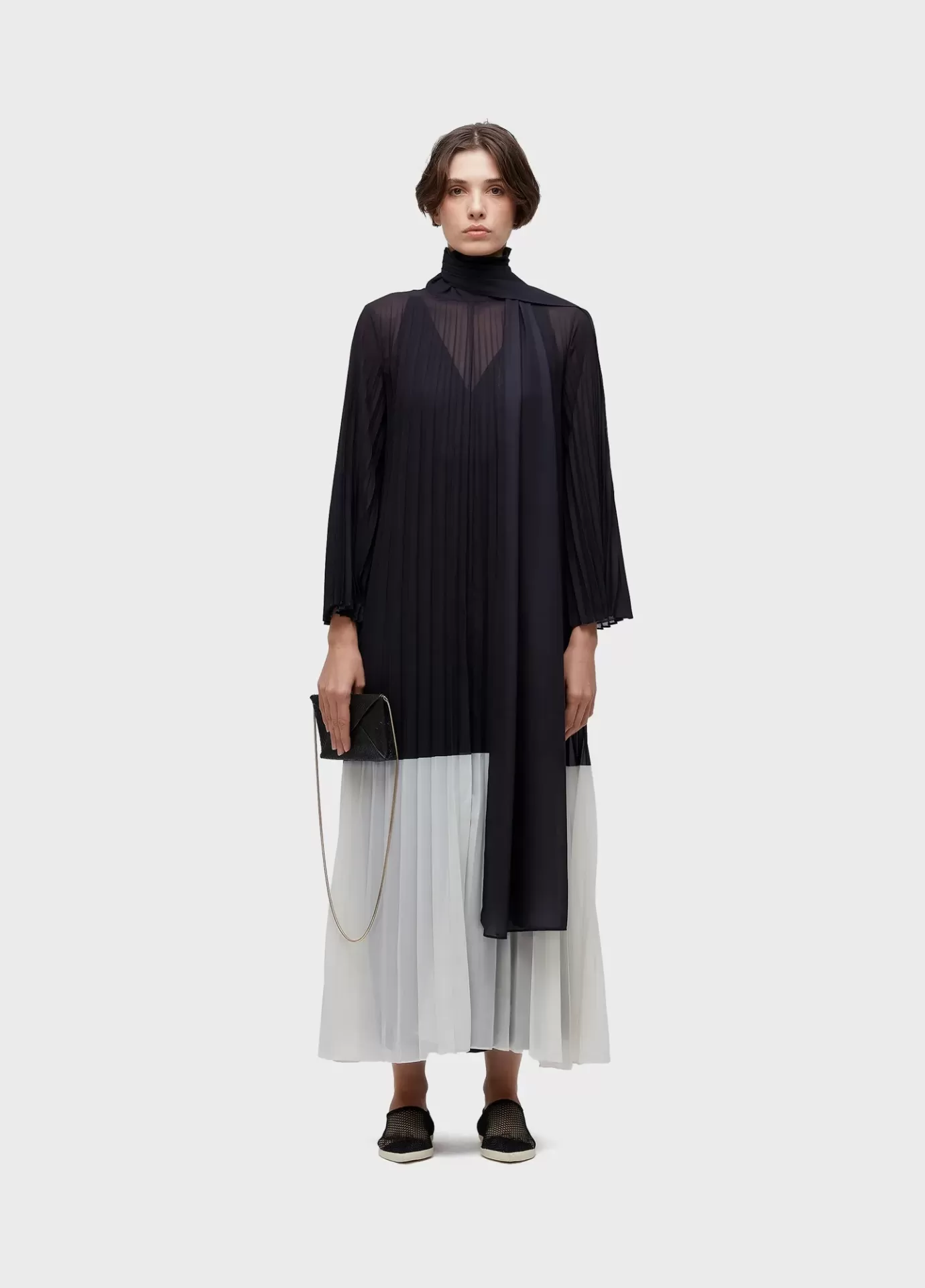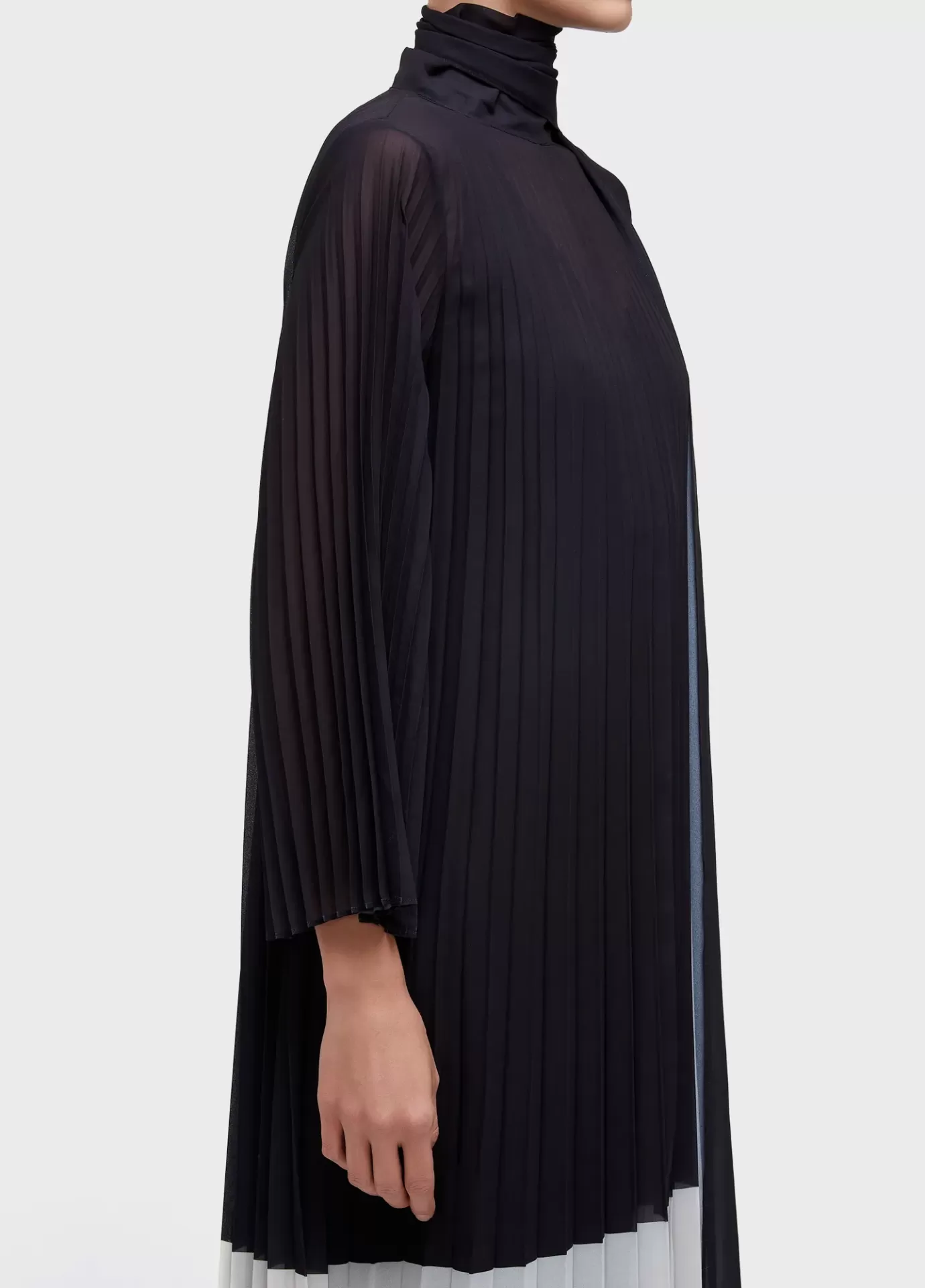 Vestido feminino, longo, crepe, manga longa flare, gola alta comprida para fechamento do vestido, color block bicolor, plissado leque. Acompanha vestido de alças decote V de crepe