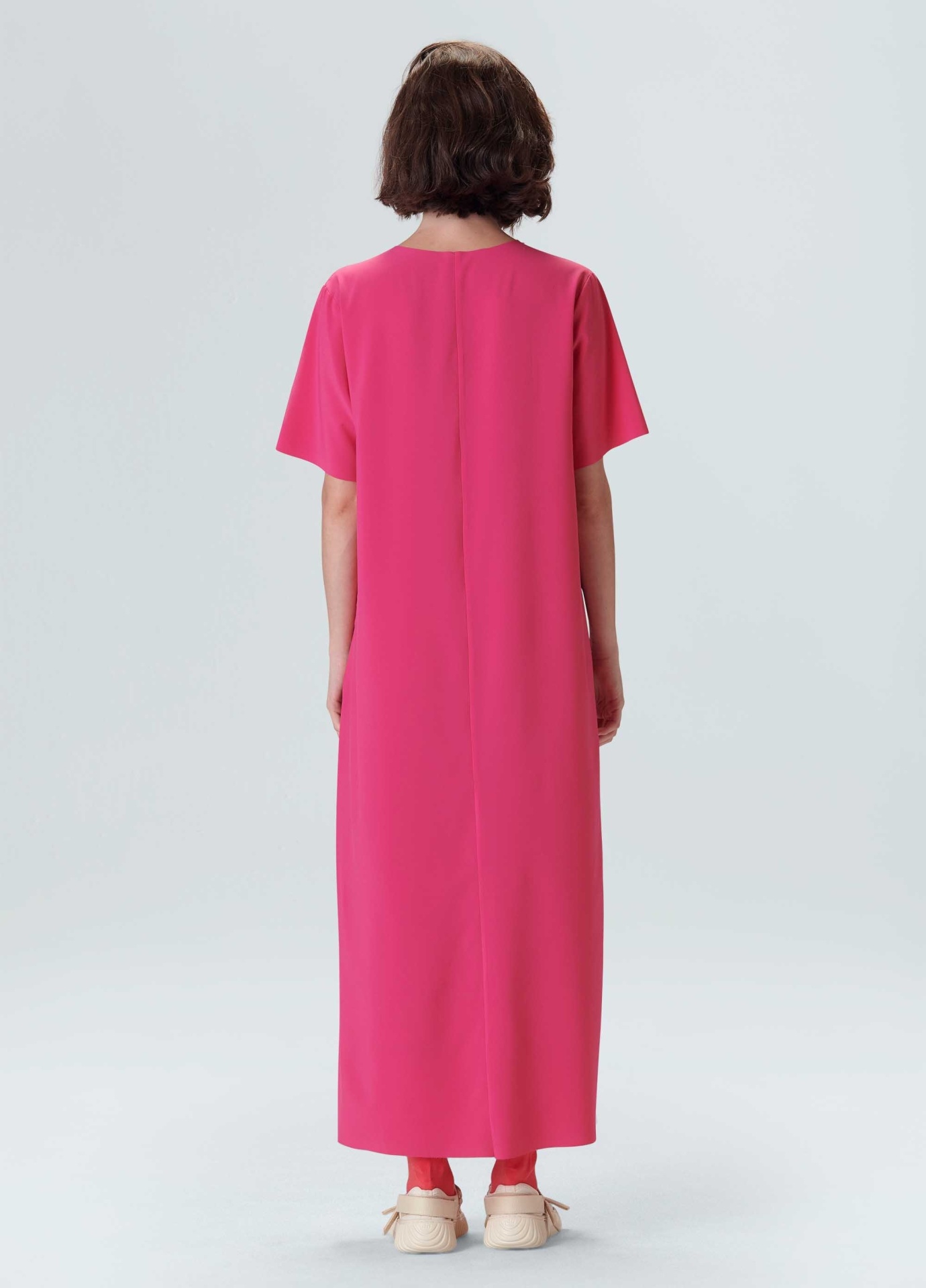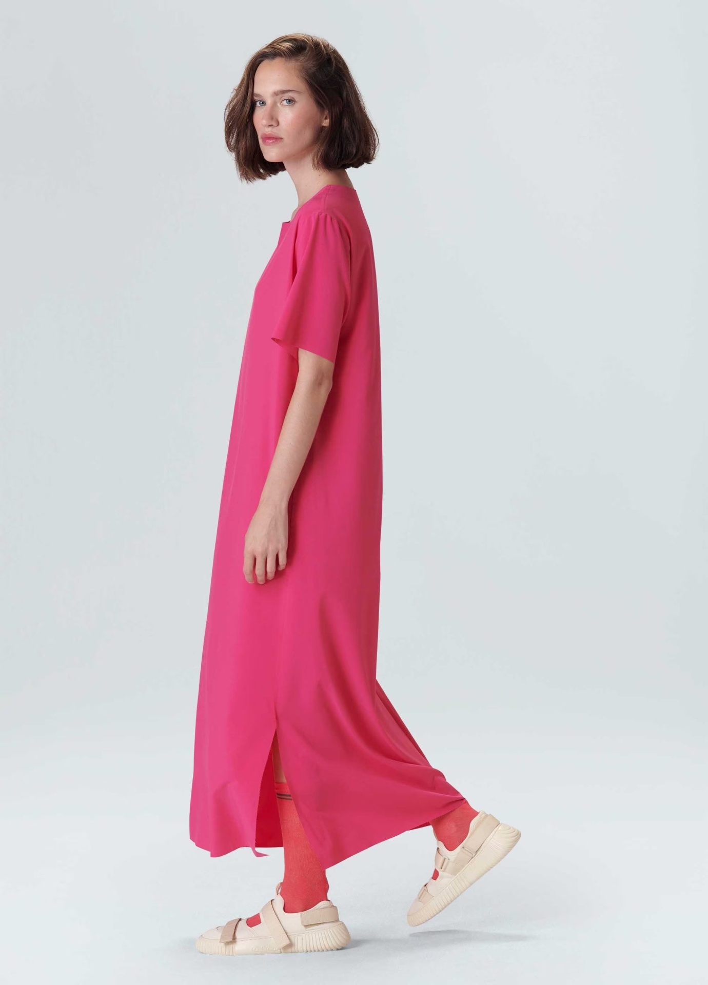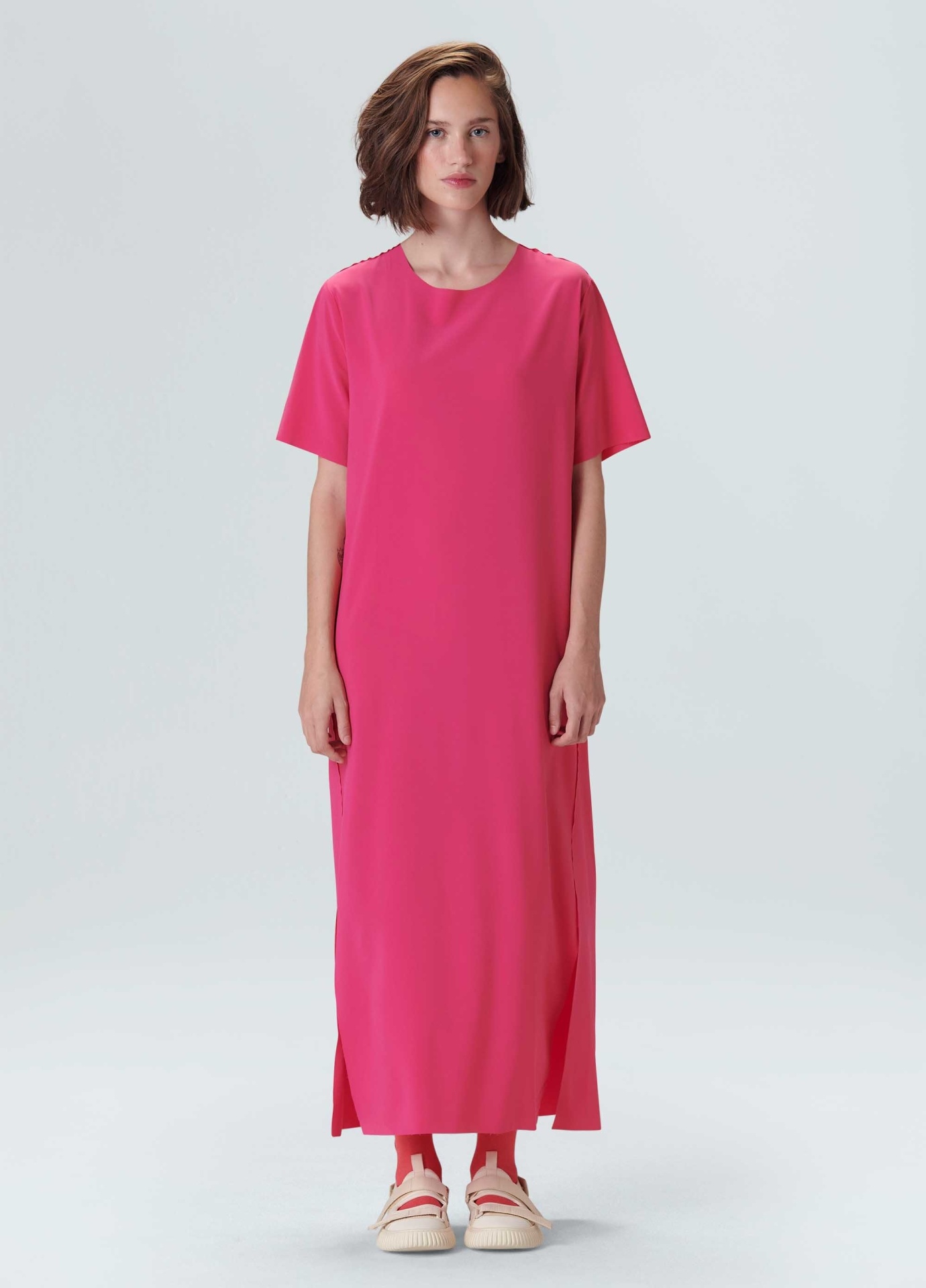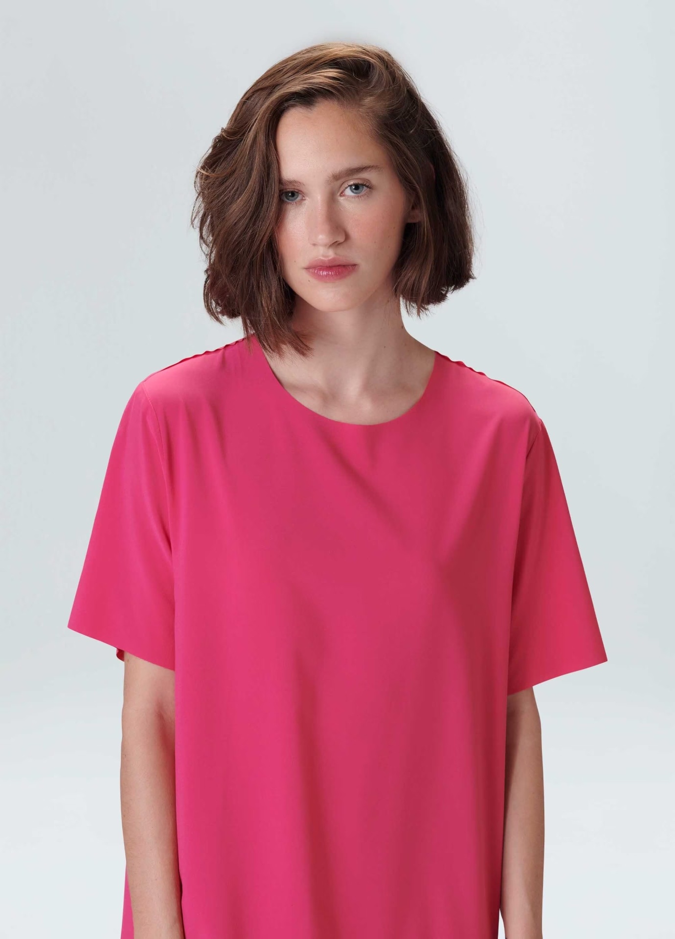 Vestido feminino, minimal, t shirt, midi. Tecido levíssimo, com toque acetinado e tecnologia Iron Free: a roupa desamassa sozinha durante o uso tornando este produto perfeito para qualquer momento do dia
