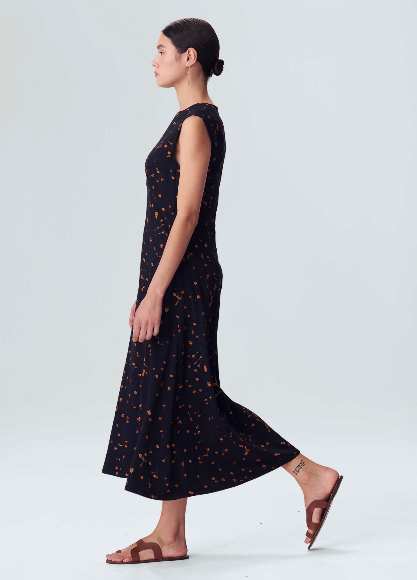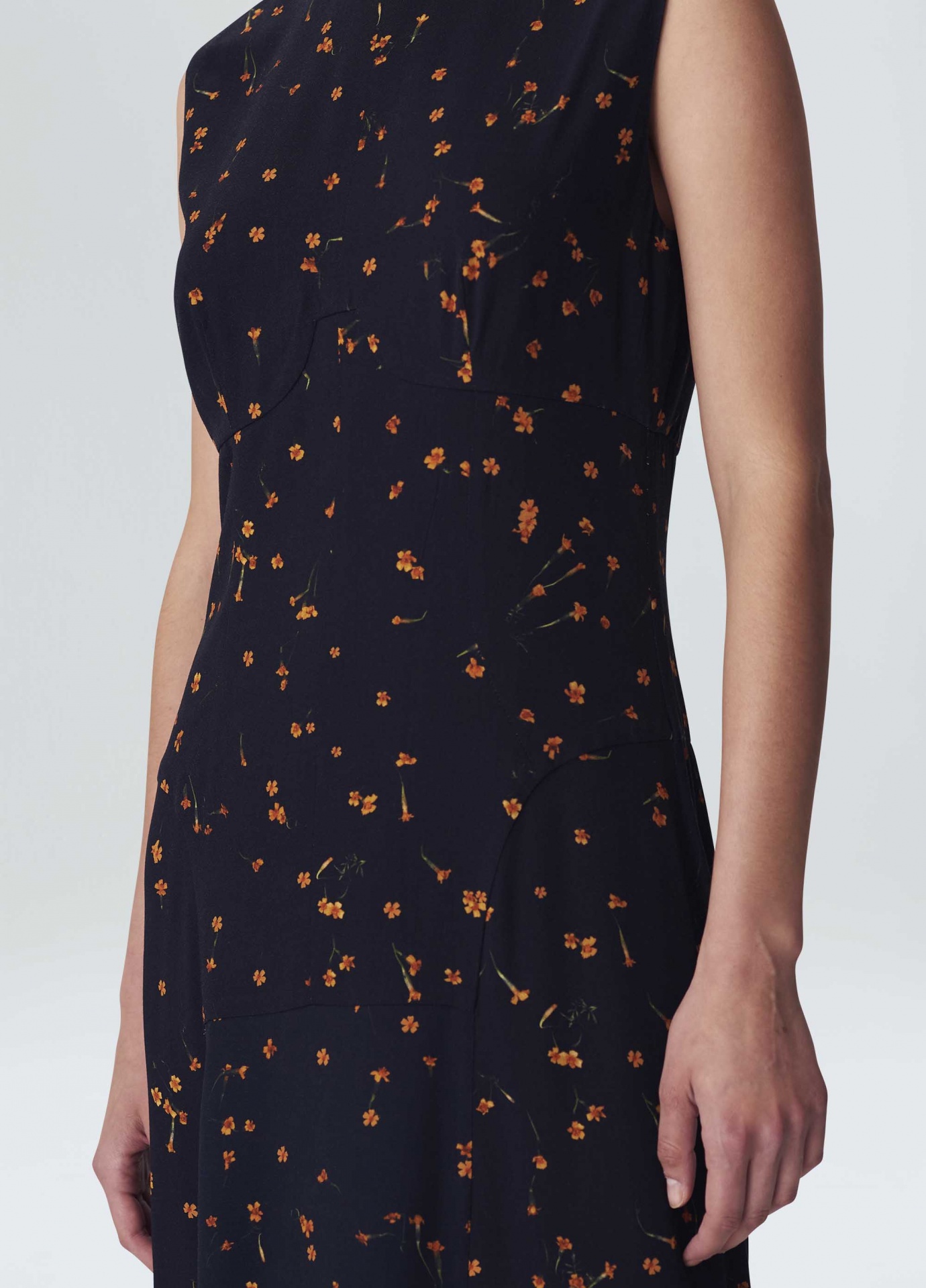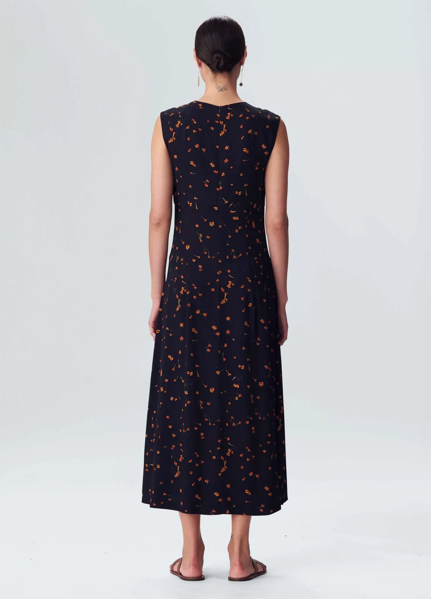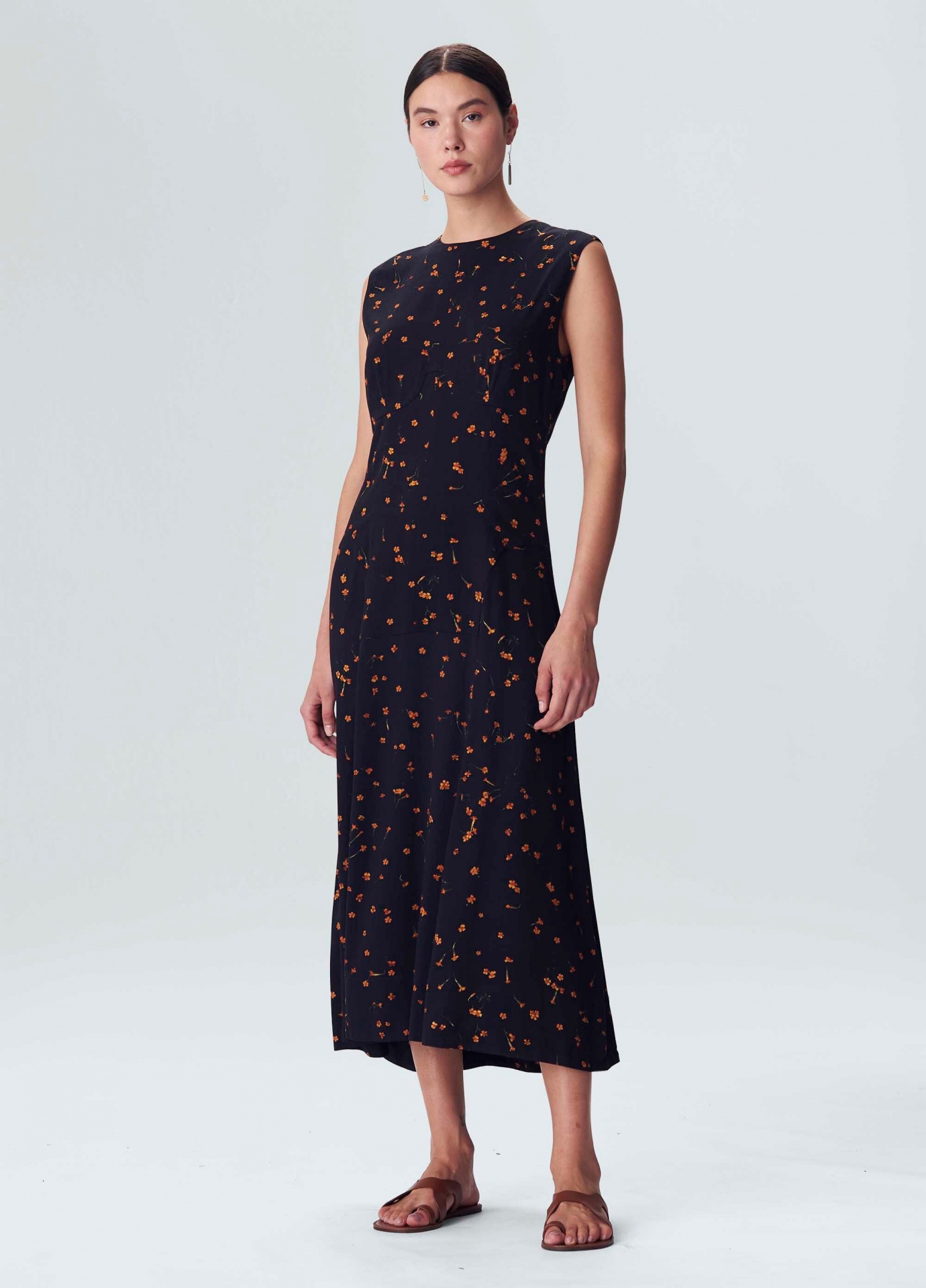 Vestido na estampa tagete mini, midi, com recortes inspirados em corsellet, acinturado com zíper centro costas em viscose-e de madeira reflorestada. E- fabrics: Produto da linha E-fabrics. Regenerate life. A viscose-e utilizada pela Osklen é confeccionada a partir da celulose de madeiras oriundas de reflorestamento e manejo sustentável certificadas pelo Forest Stewardship Council (FSC), Programme for the Endorsement of Forest Certification (PEFC) e EU Ecolabel. Por seguir critérios de manejo sustentável, a produção desta viscose reduz em 50% o uso de água e a emissão de CO2 quando comparada com a viscose tradicional.