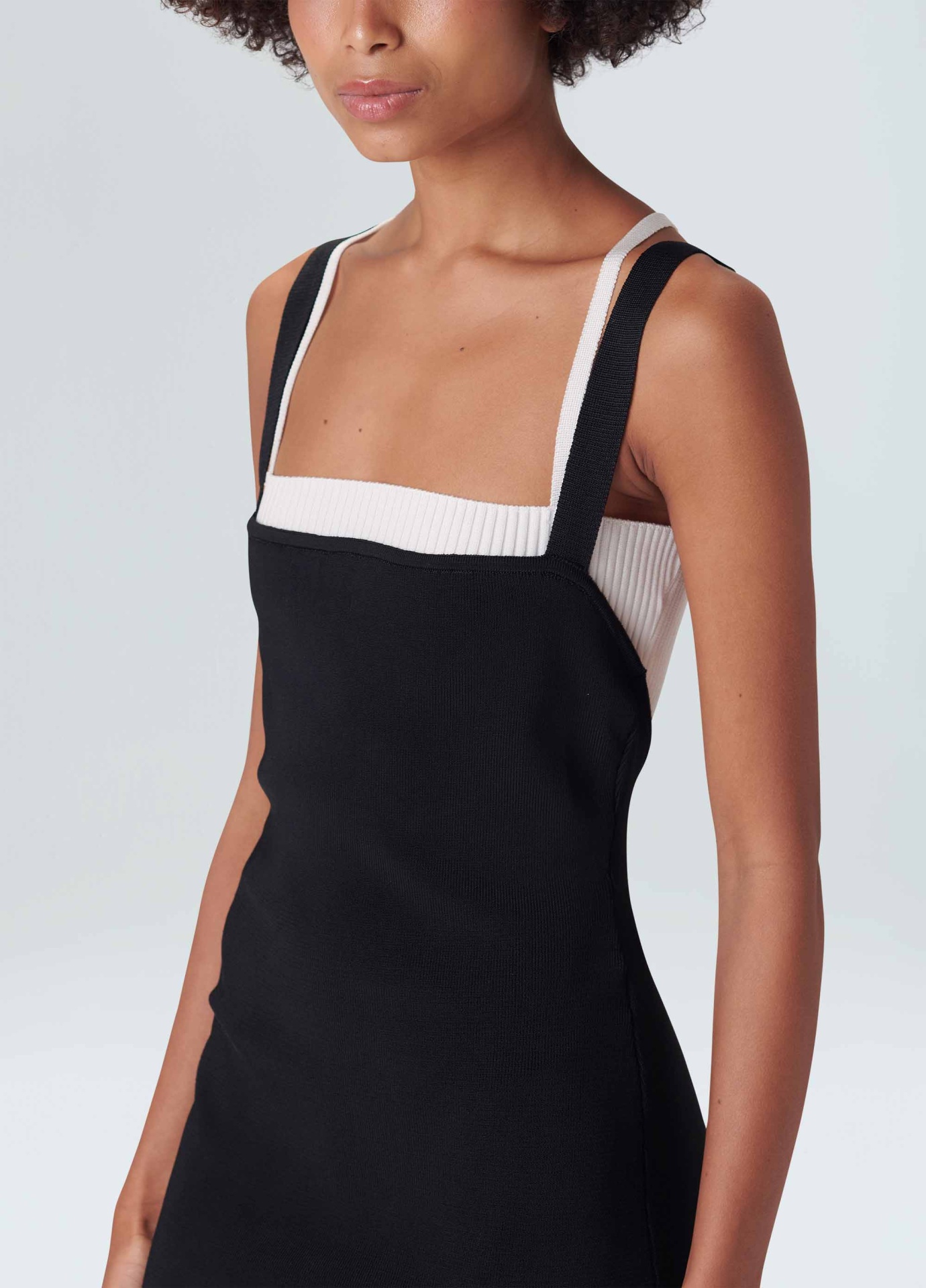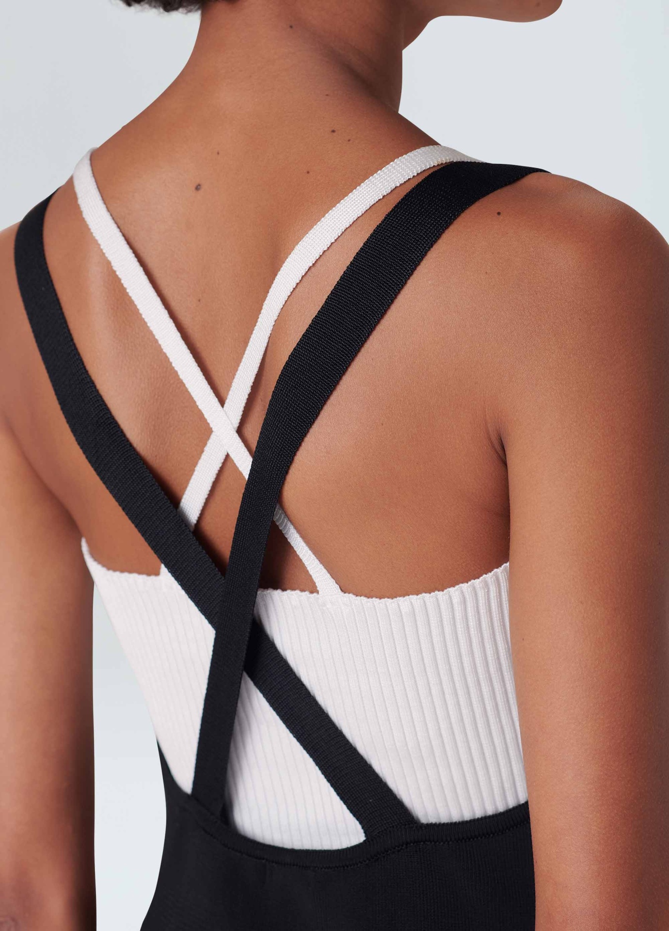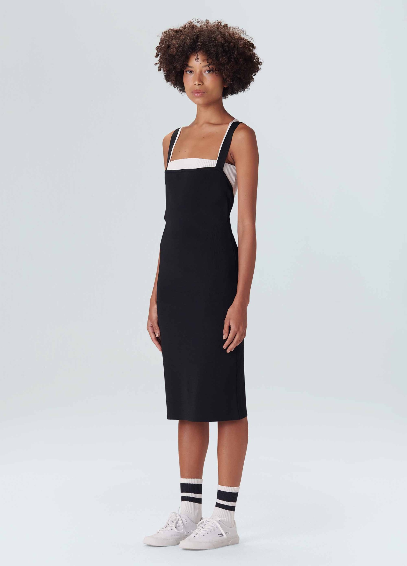 Vestido de tricot com sobreposição. A parte de cima é um vestido midi justo no corpo com decote reto e alças que cruzam nas costas. A peça de baixo é um top, também de tricot. O top é canelado, com decote reto e alças cruzadas nas costas. Quando usados juntos é possível ver os dois decotes e as duas alças de cores contrastantes sobrepostas.