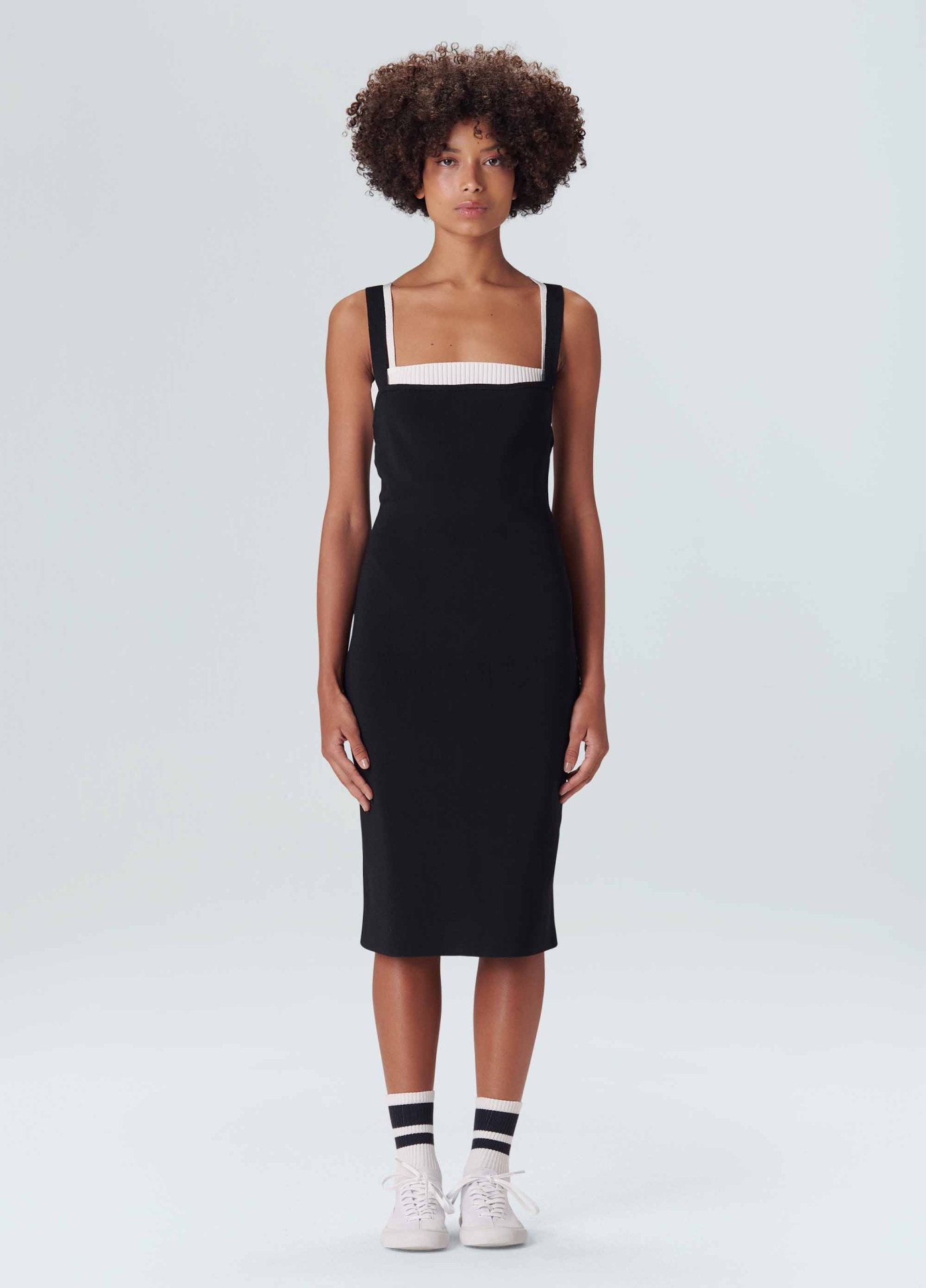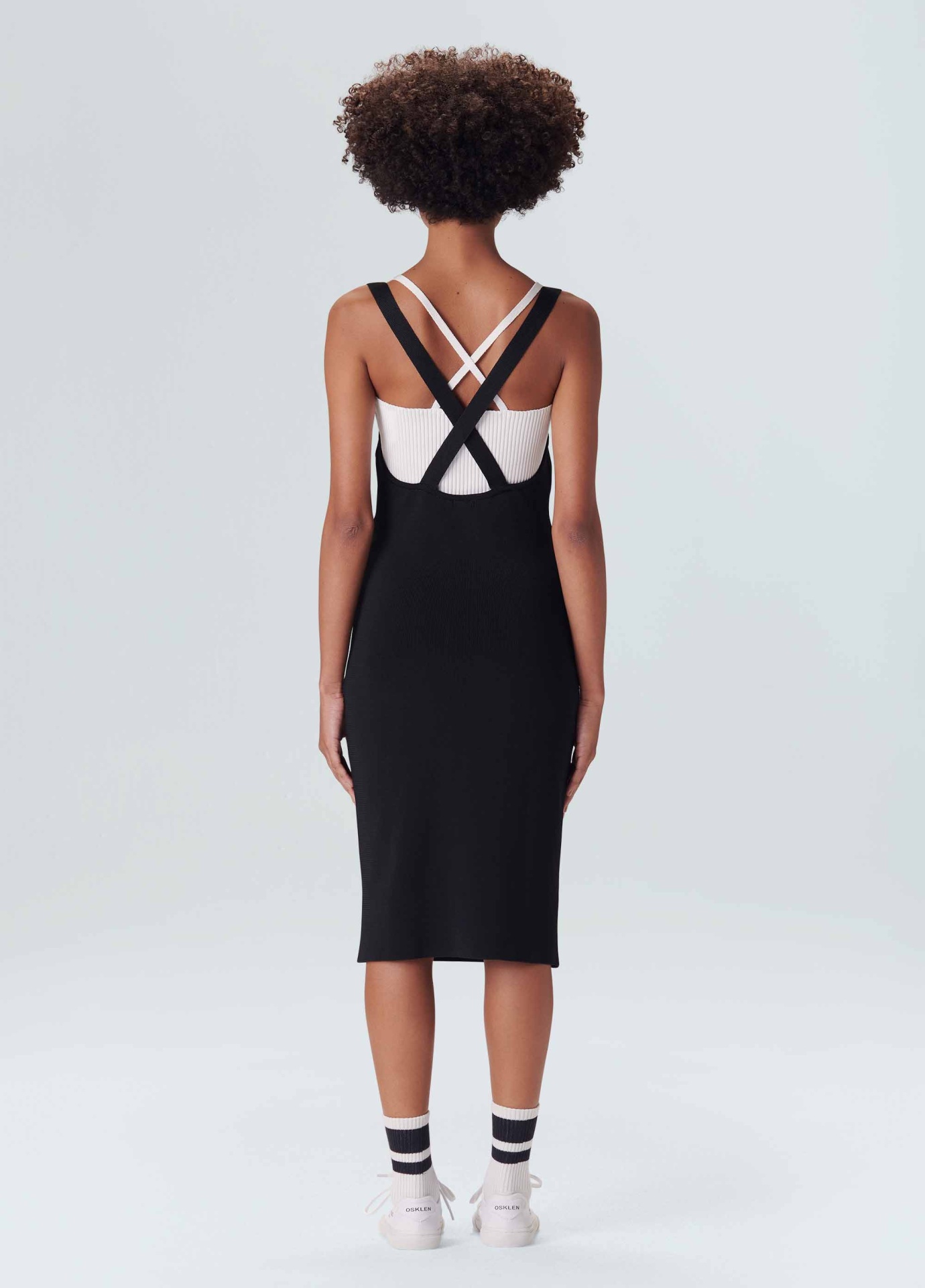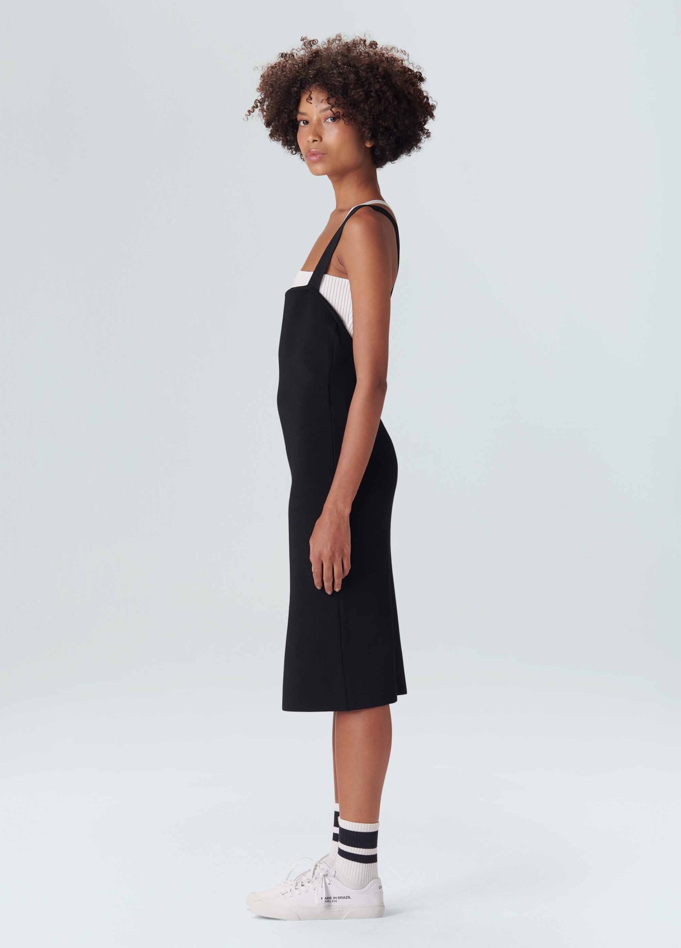 Vestido de tricot com sobreposição. A parte de cima é um vestido midi justo no corpo com decote reto e alças que cruzam nas costas. A peça de baixo é um top, também de tricot. O top é canelado, com decote reto e alças cruzadas nas costas. Quando usados juntos é possível ver os dois decotes e as duas alças de cores contrastantes sobrepostas.