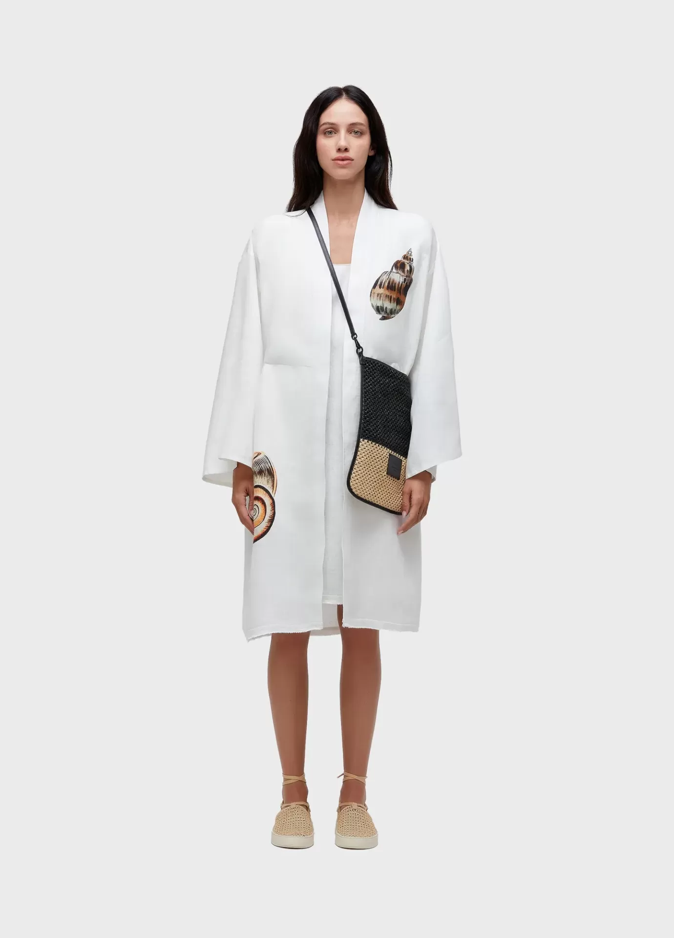 Vestido feminino. 100% linho. Vestido kimono, com manga, estampa de concha localizada