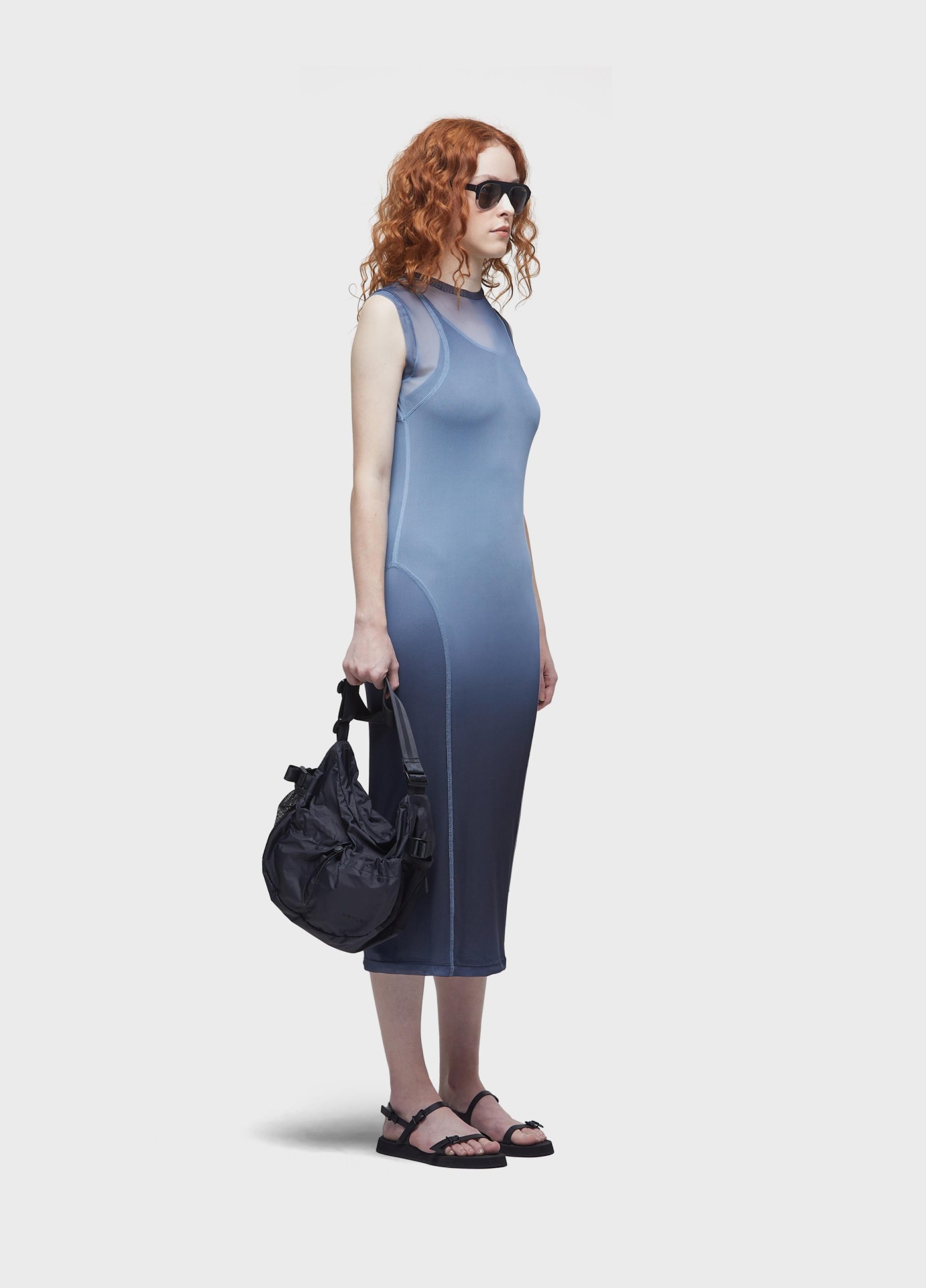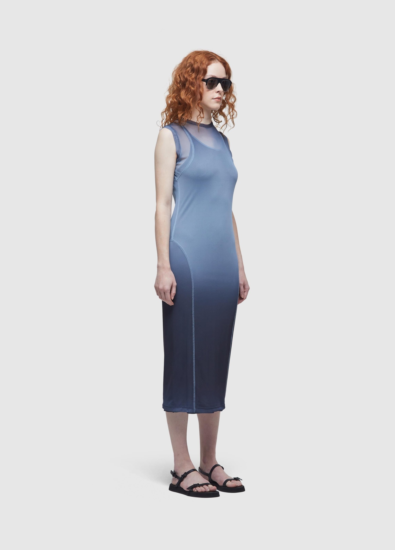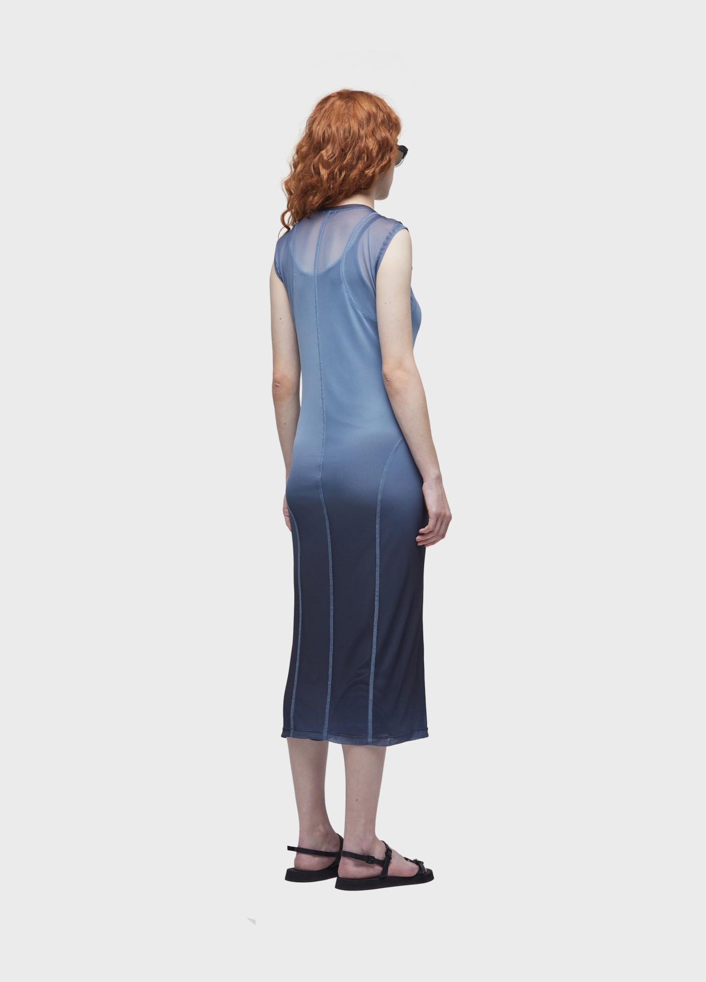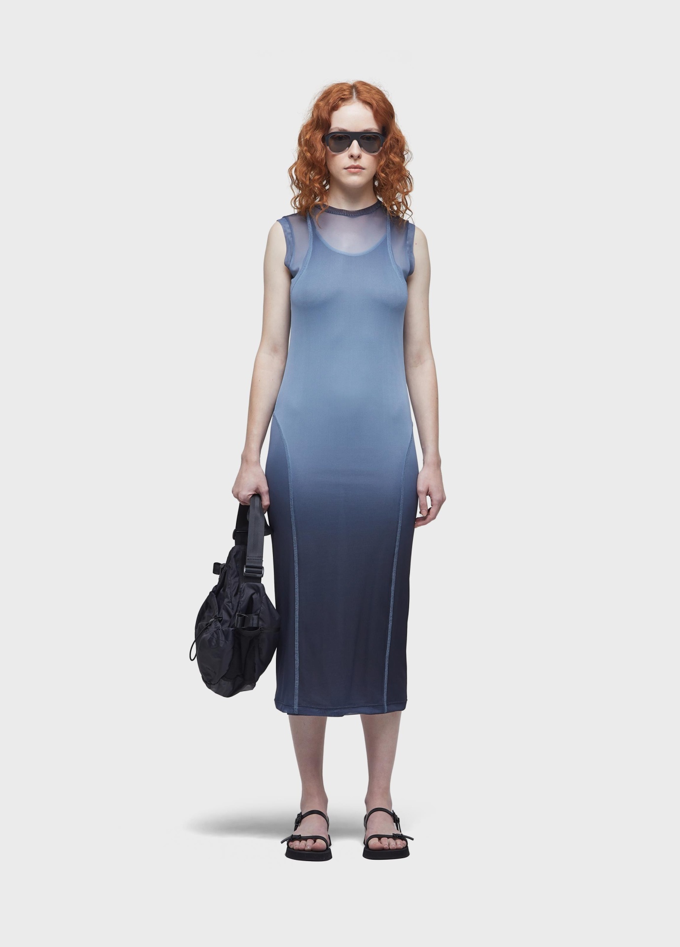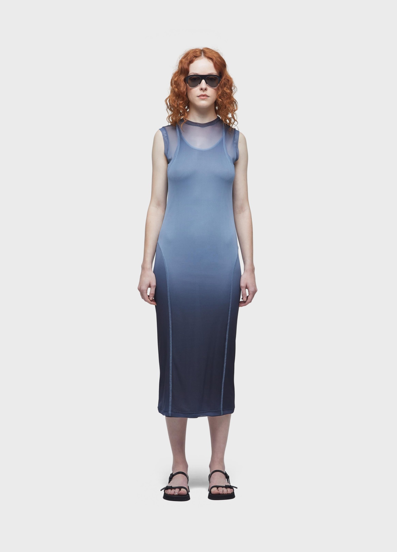 Vestido de tule com combinação em malha de viscolinho. peça justa com estampa degradê. modelagem com mangas longas e comprimento midi. recortes para remeter a roupas de surfe. combinação de alcinha.