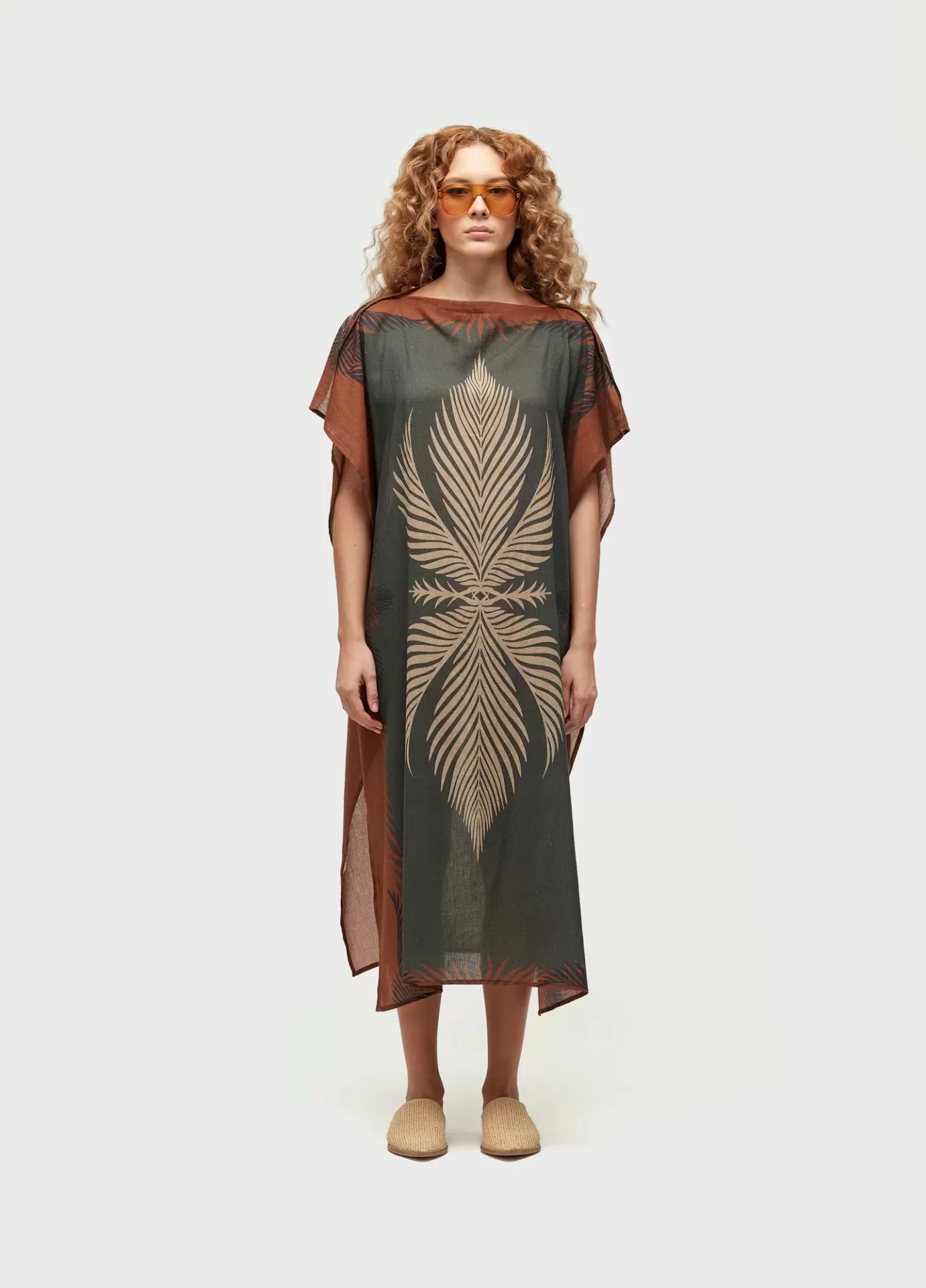 Vestido com modelagem reta, desenvolvido na estampa Leaf. A peça é toda aberta e poss