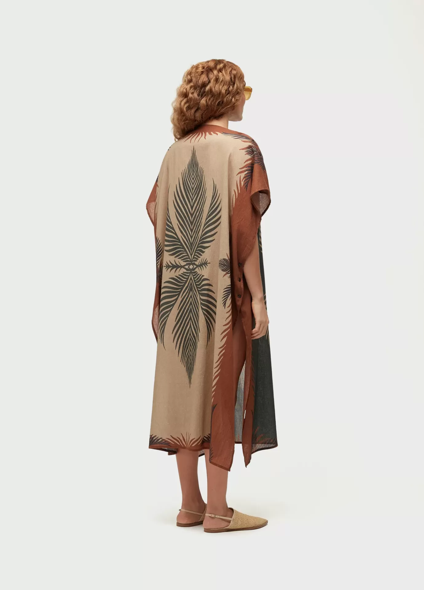 Vestido com modelagem reta, desenvolvido na estampa Leaf. A peça é toda aberta e possui fechamento com botão Osklen nas laterias e nos ombros. Feito em tecido 100% algodão com estampa exclusiva Osklen. Frente e costas possuem estampas diferentes para uso dos dois lados. A peça pode ser totalmente aberta e usada como lenço.