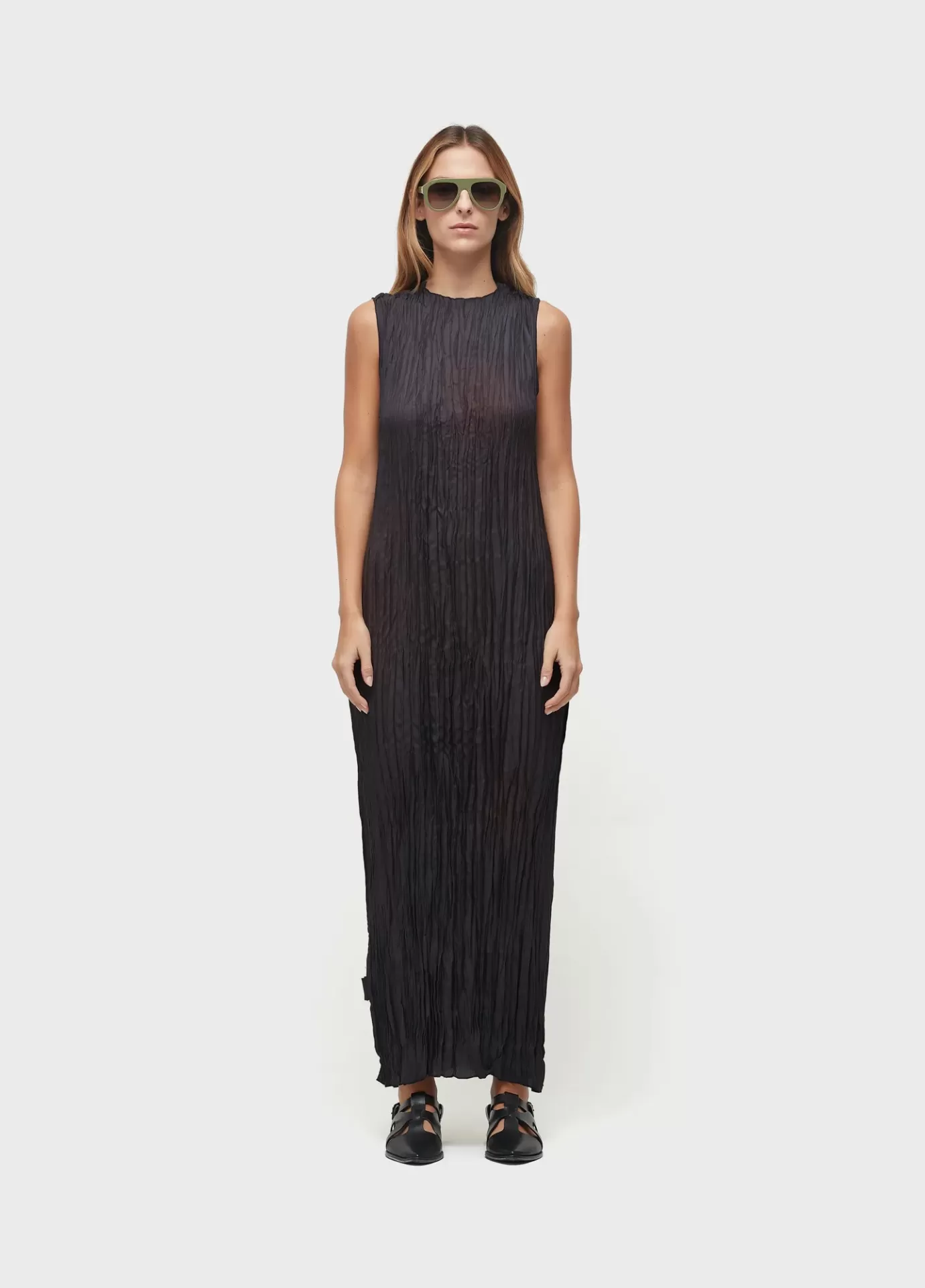 Vestido longo, feminino, satin amassado, double face, sleeveless, gola levemente alta