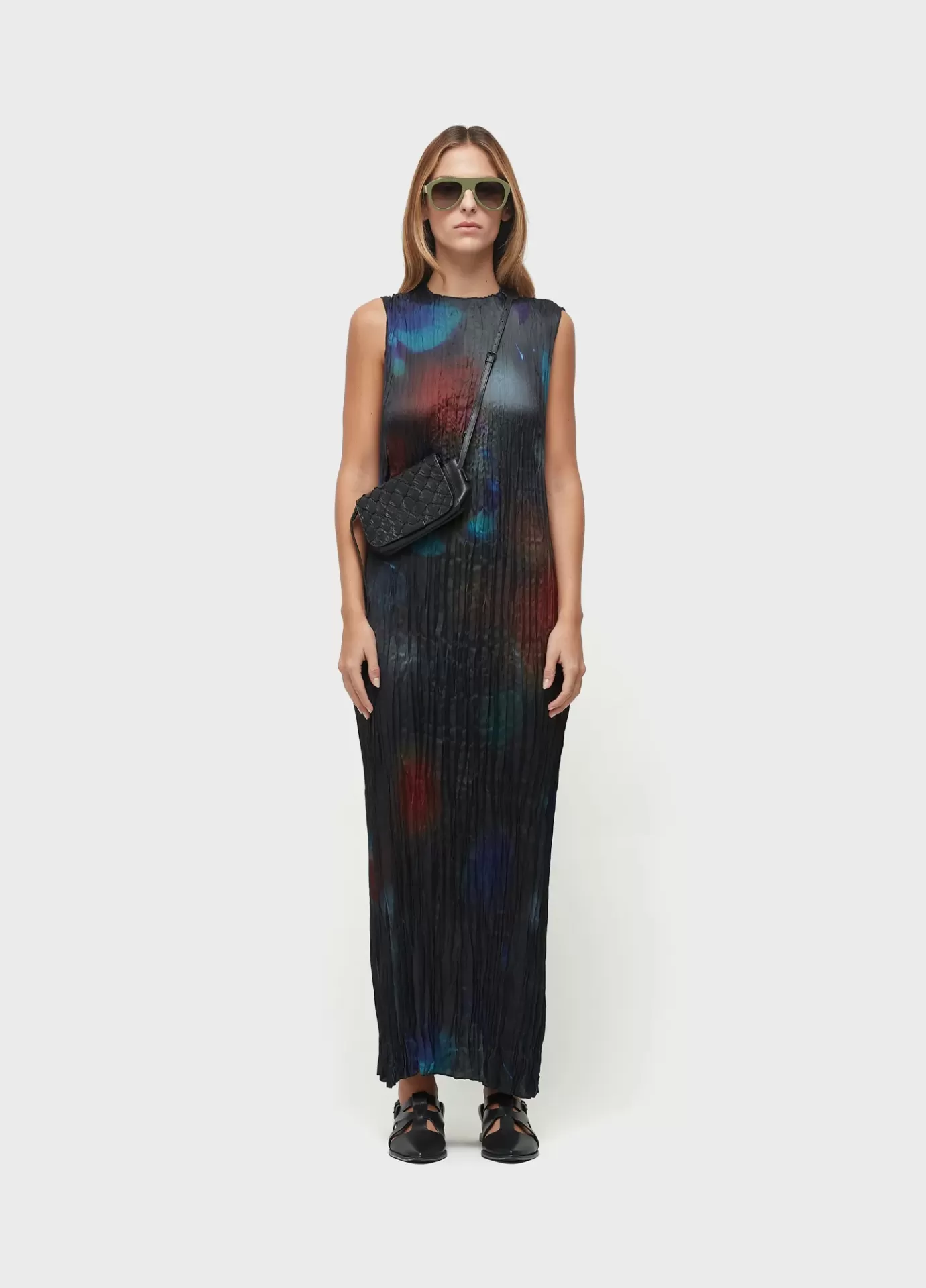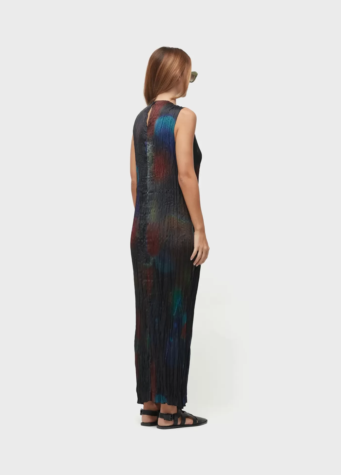 Vestido longo, feminino, satin amassado, double face, sleeveless, gola levemente alta sem recorte, estampa rose blur, acabamento micro overloque